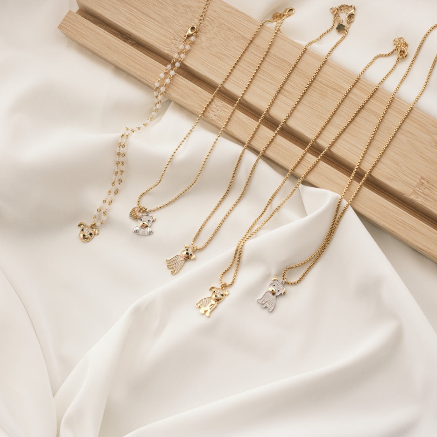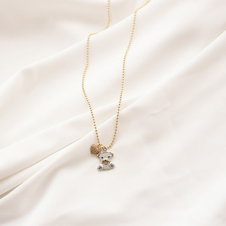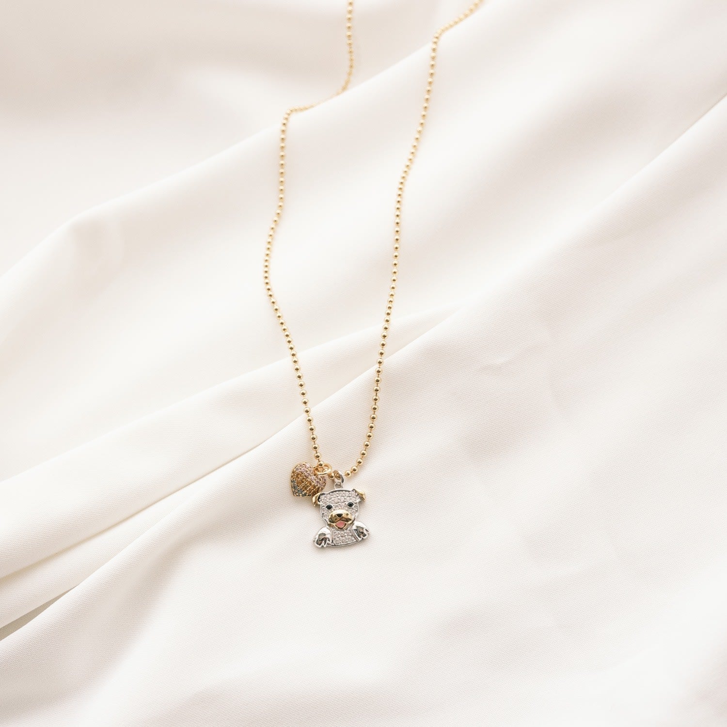 This necklace is made of high-quality 24k gold plated brass. It features CZ studded Pit Bull and rainbow heart pendants.