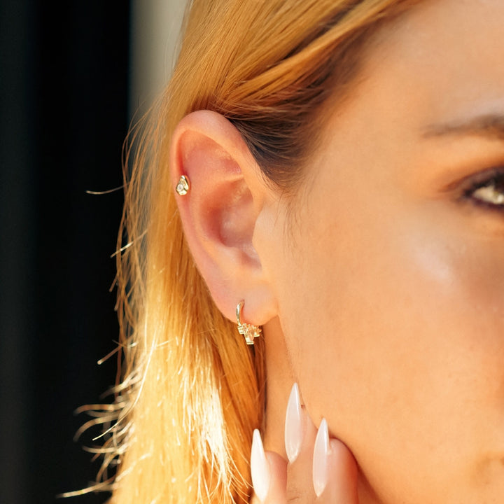 This Sterling Silver Helix Tragus Piercing - Silver by Spero London is a subtle yet elegant way to elevate your ear stack. Made from high-quality sterling silver, this piercing adds a touch of delicate shine and sophistication to your ear. It is the perfect accessory for those who appreciate understated luxury and a minimalist approach to personal style.