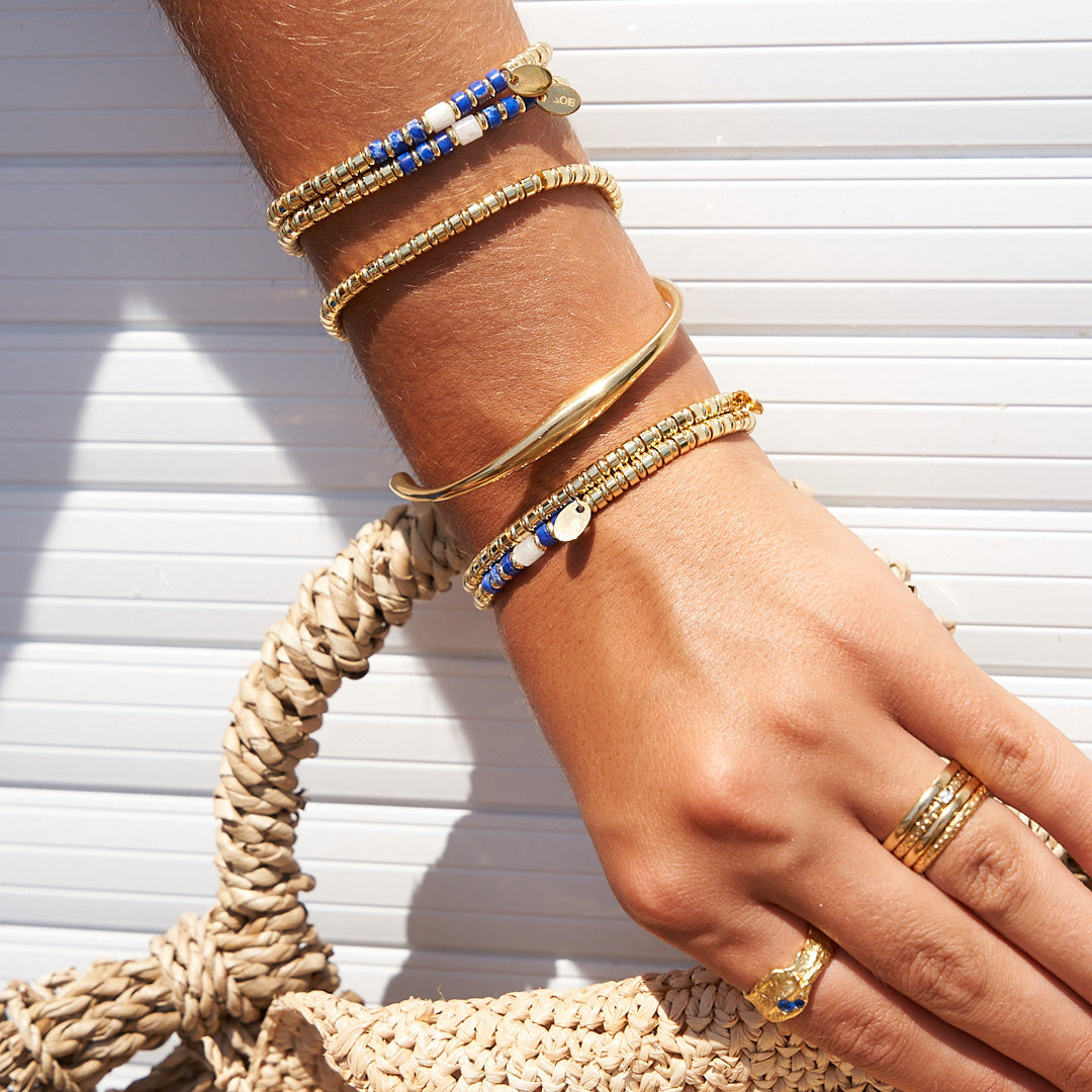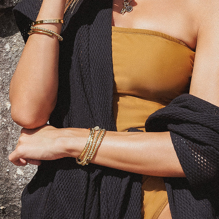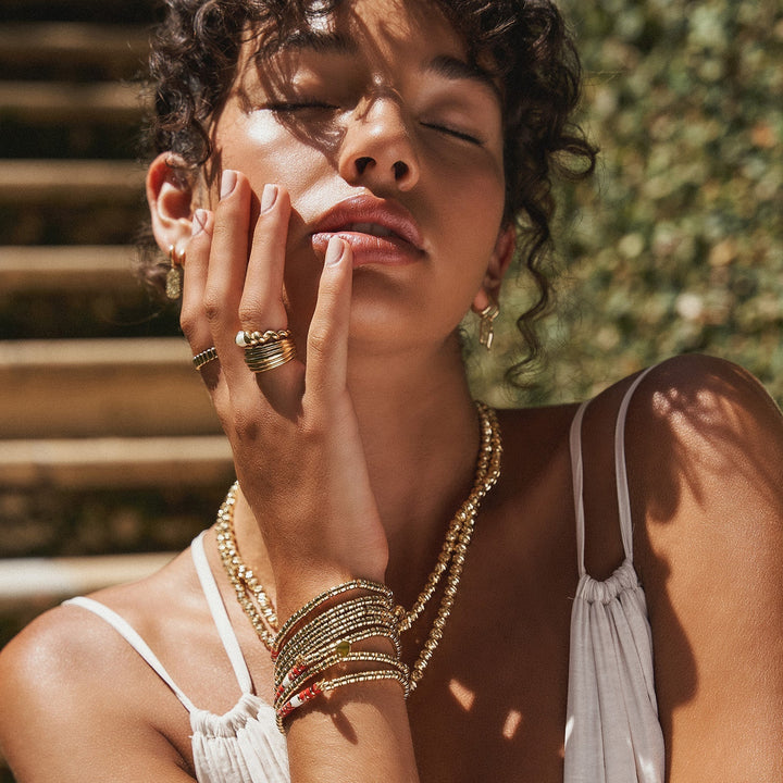 This Monza Bracelet by Arms of Eve is a radiant gold-beaded treasure, designed to elevate every stack. Playful yet polished, it glows with versatile charm, making it a prize-worthy addition to any collection. Lightweight and easy to wear, it slips on effortlessly and shines as a solo statement or layered look, adapting to both casual and dressy styles.
