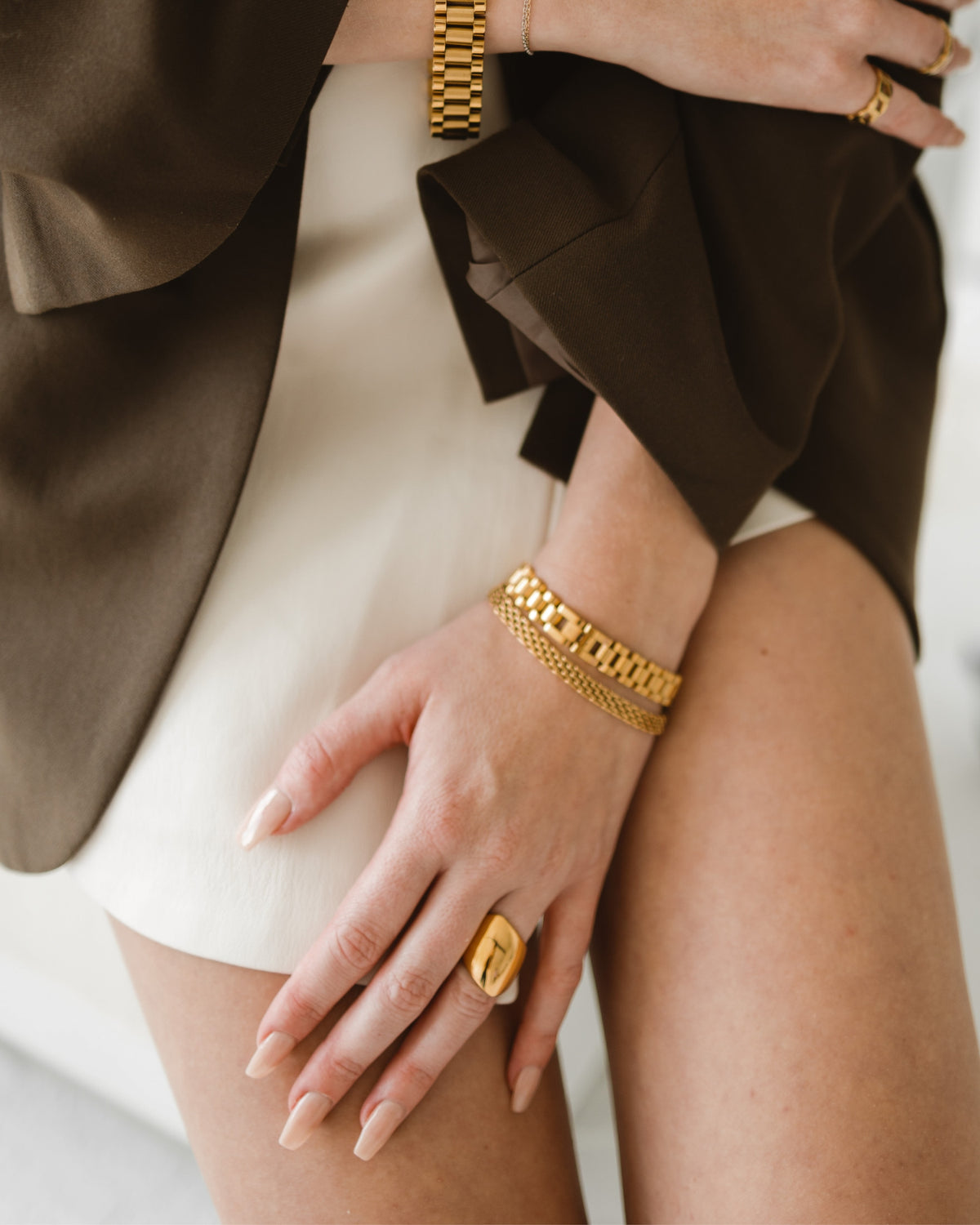This Zuri Mesh Chain Bracelet by Viea introduces a bold, textural twist to the classic bracelet. The fine mesh design adds an industrial yet elegant appeal, finished with a lobster clasp and extender for a perfect fit. Designed to be worn alone as a statement or layered for depth, it offers contemporary sophistication with lasting durability.