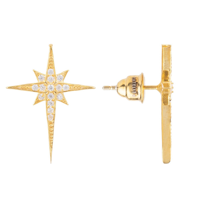 The North Star Small Stud Earrings by Latelita are delicate and sparkling. Like their namesake, they are the brightest star in the constellation. These earrings feature a beautifully formed star adorned with white zirconia. They are made from 925 sterling silver dipped in 18ct gold and are ideal for adding a touch of glitz to any outfit.
