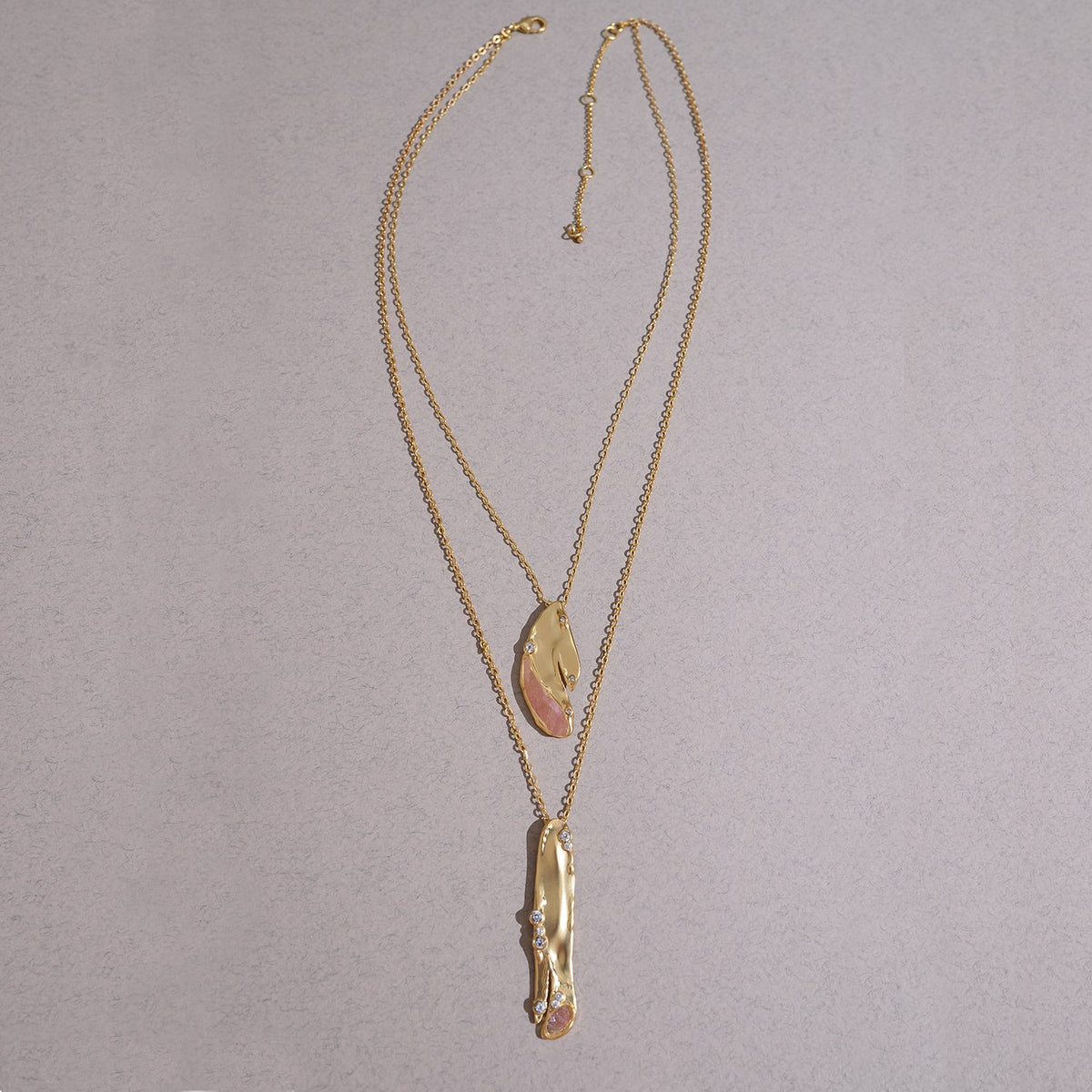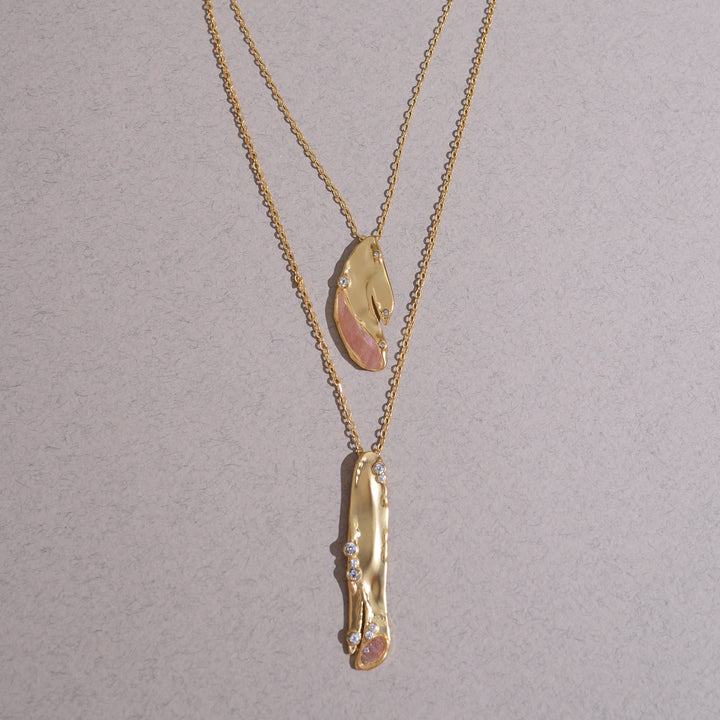 This Organic Double Drop Necklace with Strawberry Quartz by Rare Matters Jewelry exudes fluid elegance. With two organic pendants—one feather-like, the other petal-shaped—it embraces the beauty of imperfection and natural movement. Strawberry quartz adds a delicate blush, symbolizing love and balance.