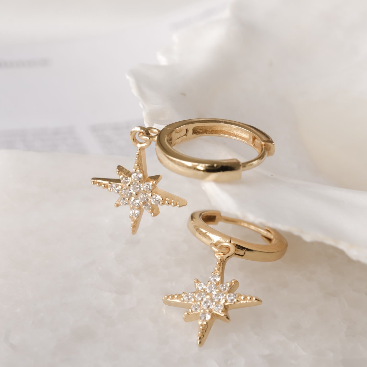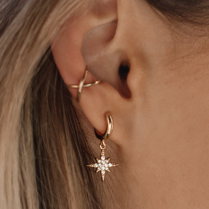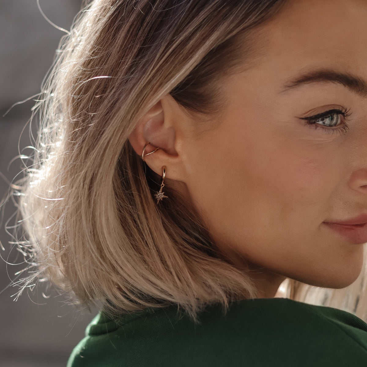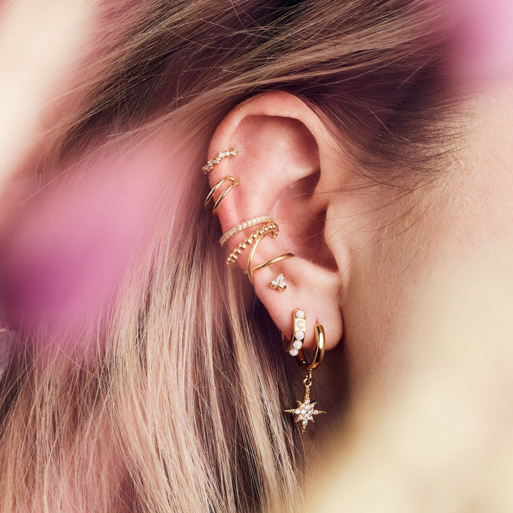 These Starburst Huggies in Gold by Cartilage Cartel are a perfect blend of delicate design and celestial sparkle. The huggie hoops are adorned with a constellation of nano cubic zirconia stones, creating a brilliant, starburst effect that catches the light beautifully. Their petite size makes them ideal for wearing alone for an elegant, minimalist look or for stacking and layering with other studs and cuffs to create a personalized ear party. They embody a whimsical yet sophisticated vibe, perfect for everyday sparkle.