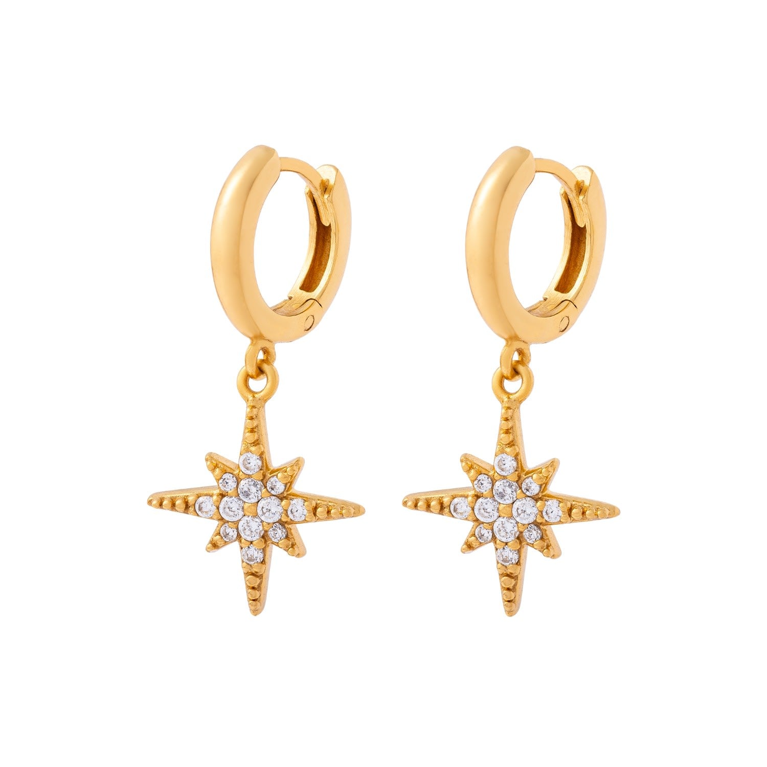 These huggie hoops are crafted from 18-carat gold-plated 925 sterling silver with nano cubic zirconia stones. They feature a generous micron plating and a protective e-coat layer for tarnish resistance.