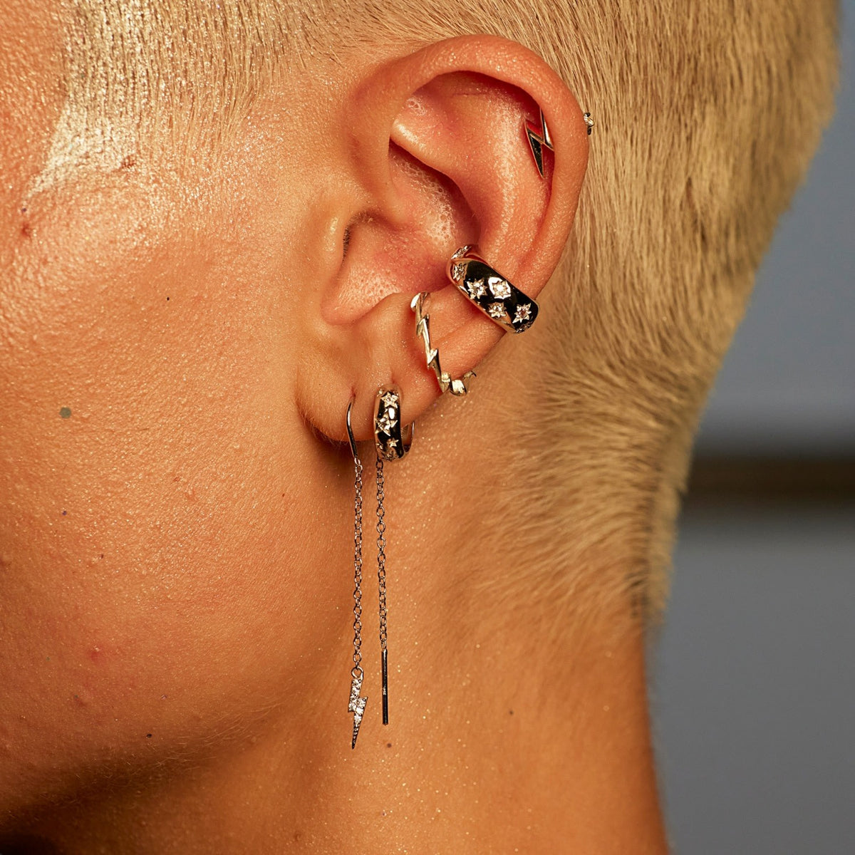 These threader earrings are crafted from recycled sterling silver with rhodium plating. The lightning bolt motifs are adorned with clear cubic zirconia stones.