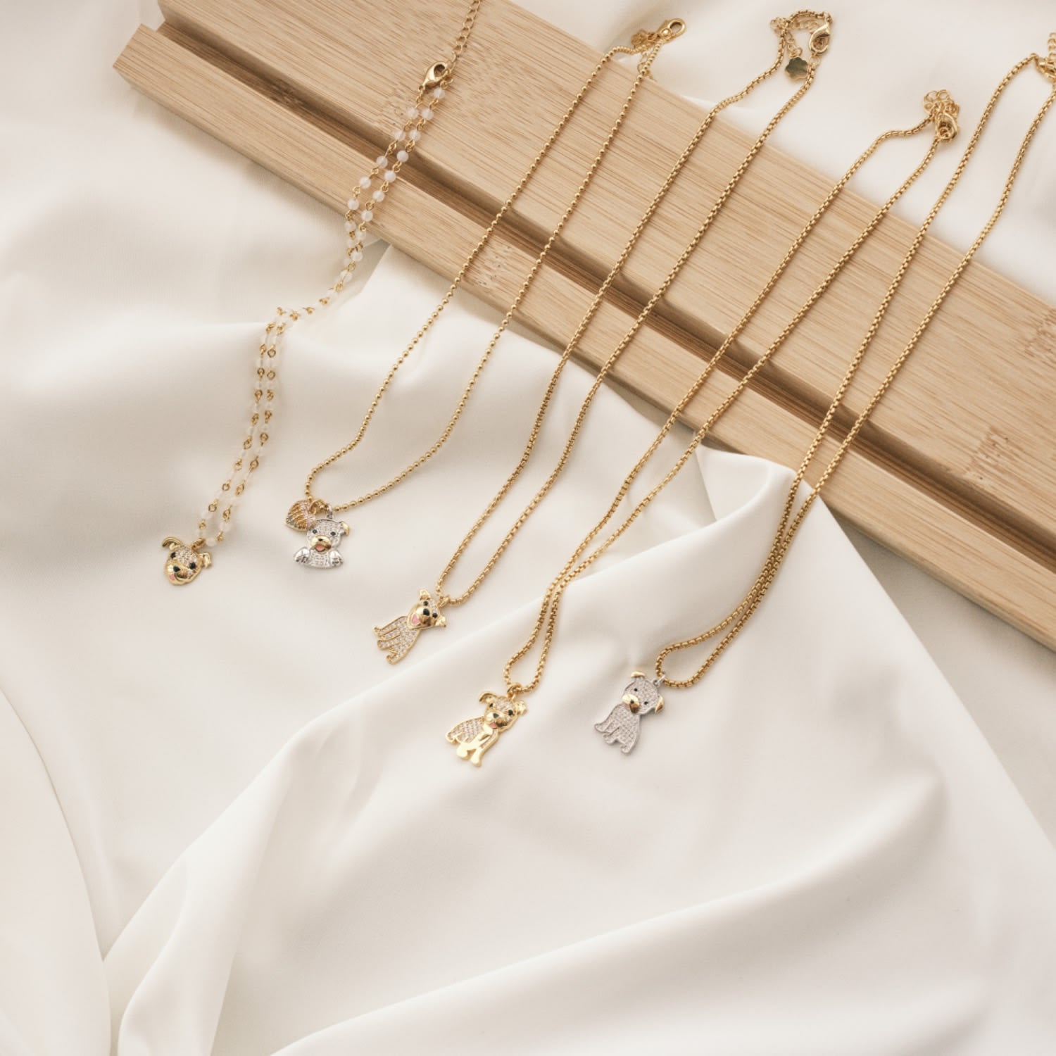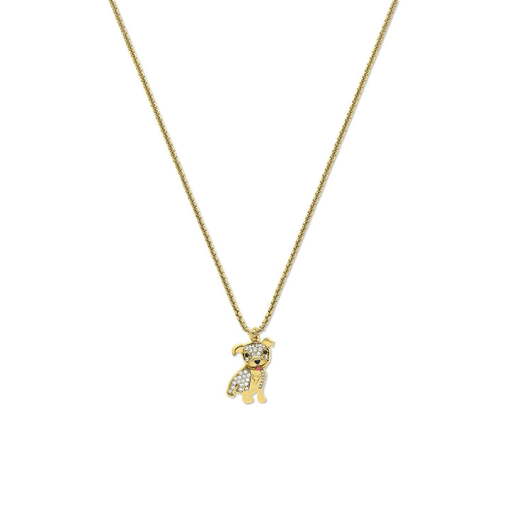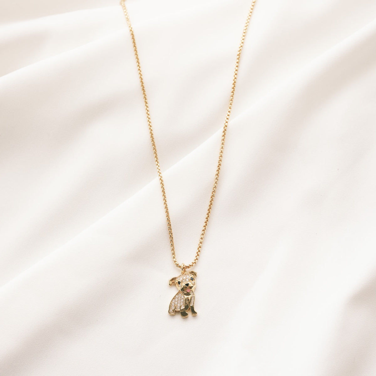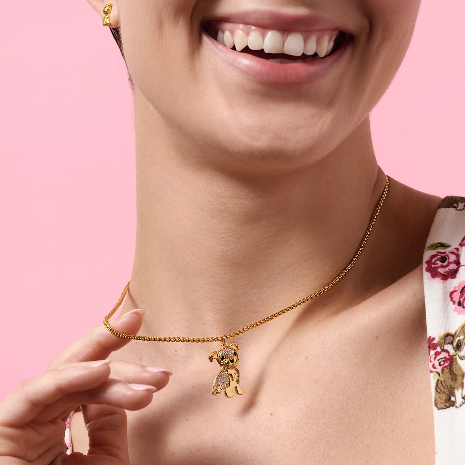This pendant necklace is made of 24K gold plated brass and features a Cubic Zirconia studded bulldog pendant. It has a lobster closure.