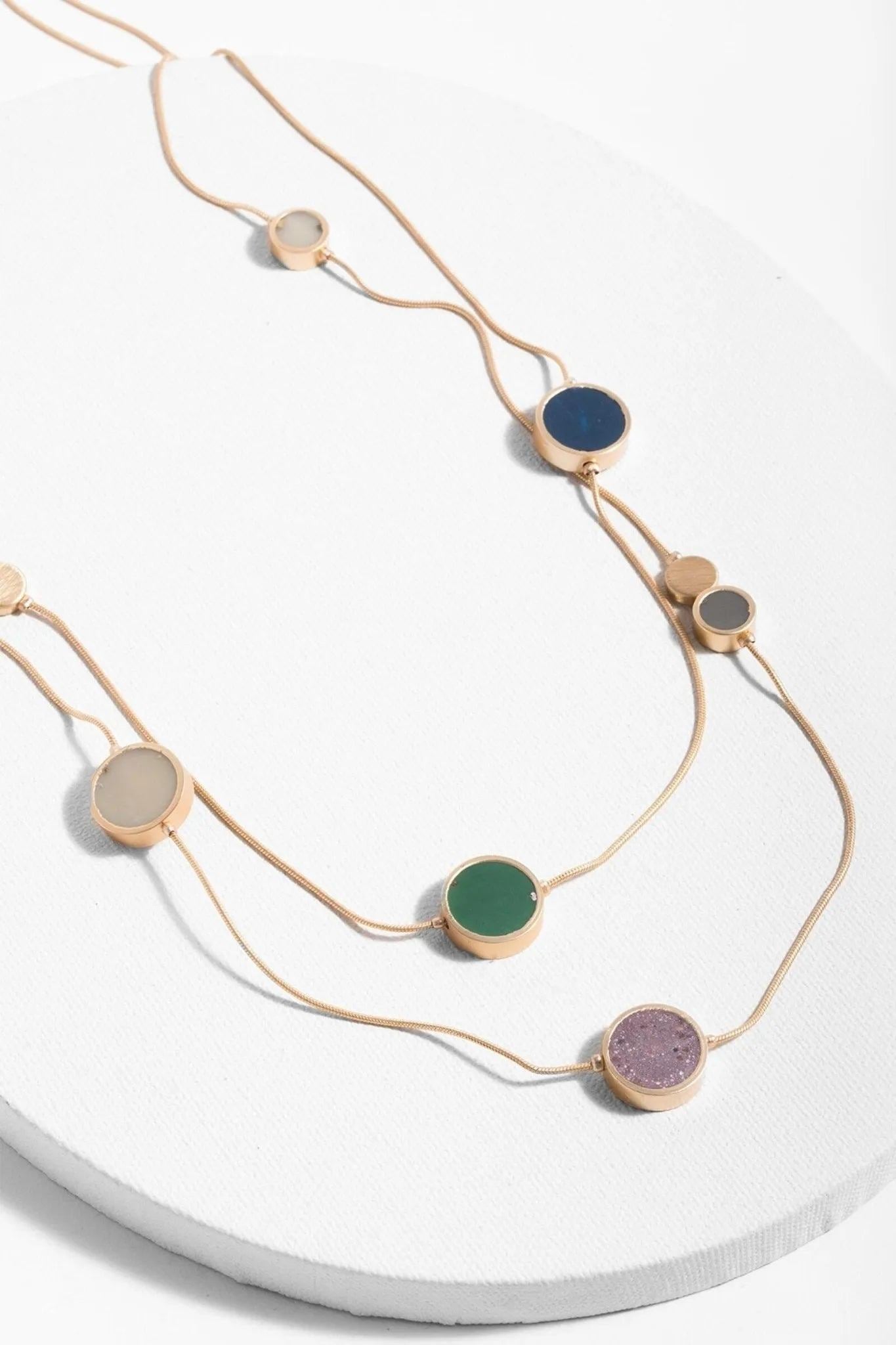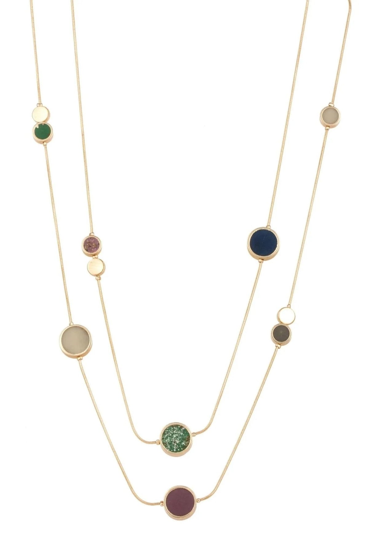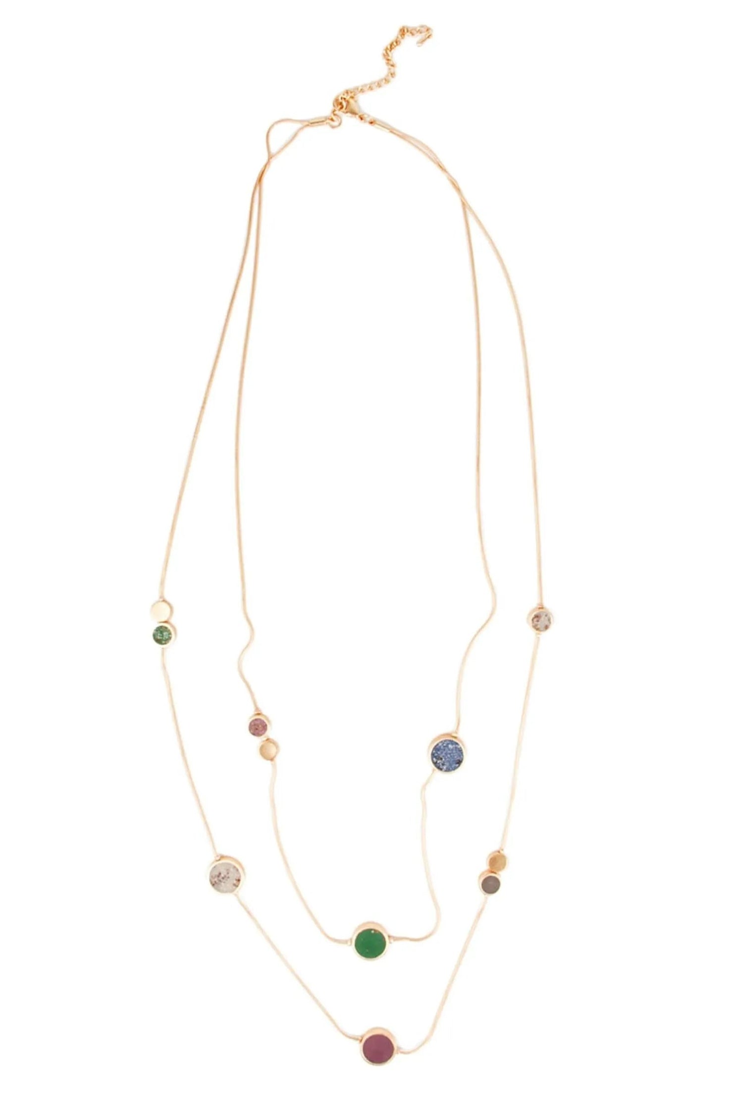 This Layered Gold Multicolor Stone Necklace Long by Saachi is a perfect accessory for adding a pop of color and style to your day-to-day routine. This eye-catching, layered gold necklace is complemented with colorful resin and natural stone details. It’s a great piece for dressing up and adds a touch of effortless style.
