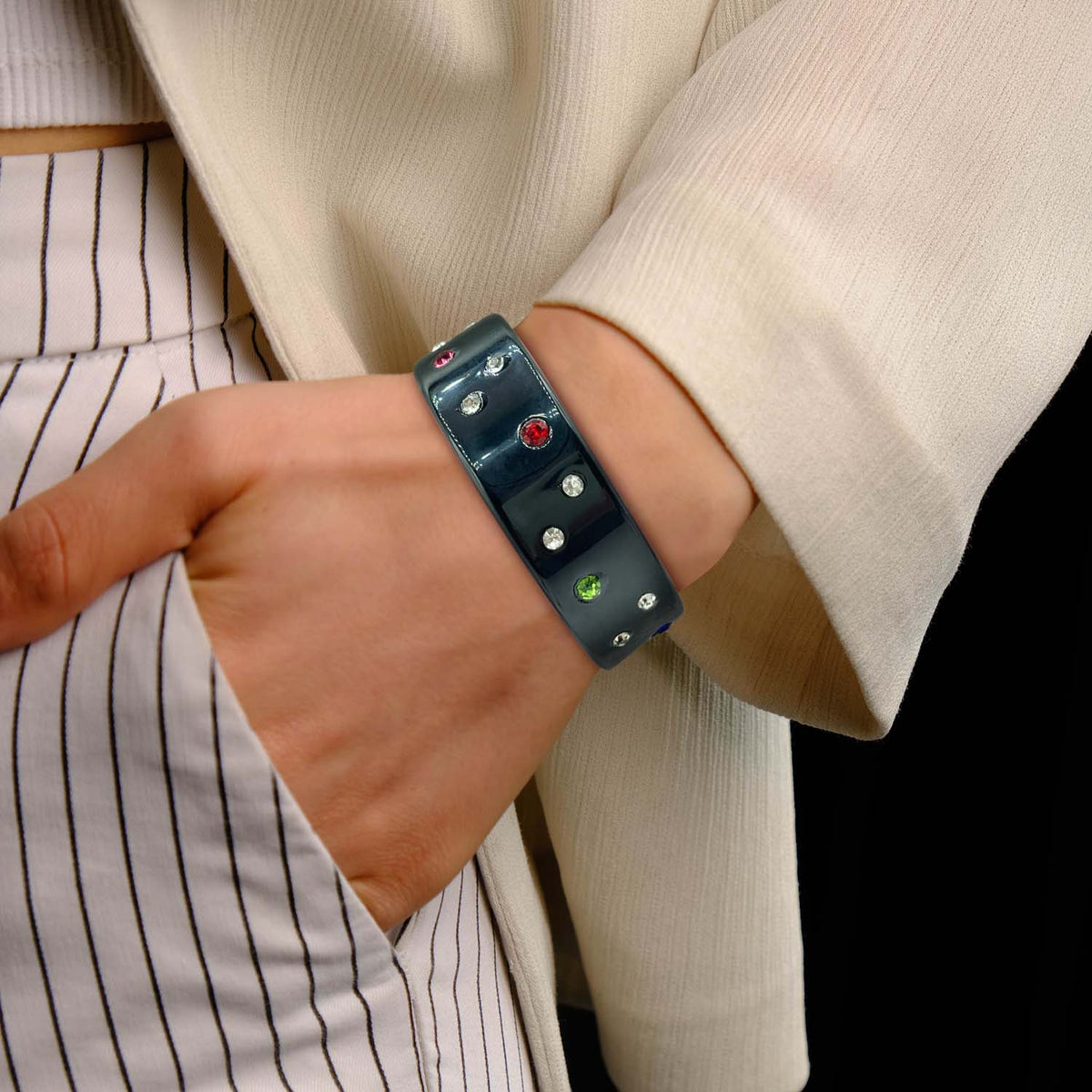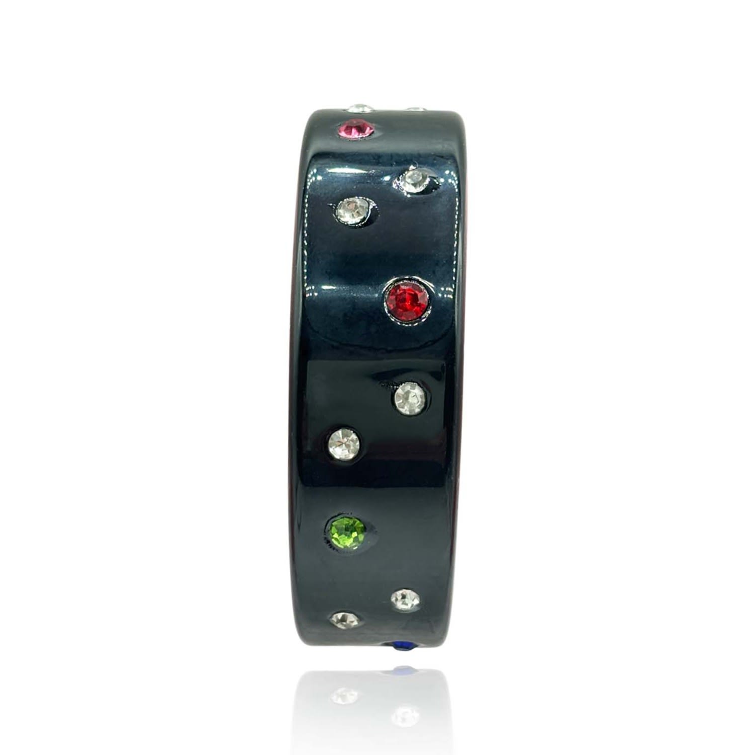 This bangle is crafted from black resin and is studded with multi-color crystals.