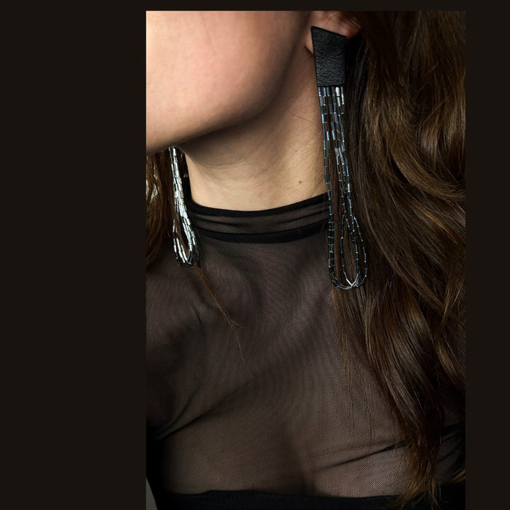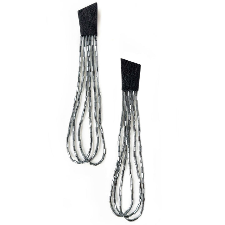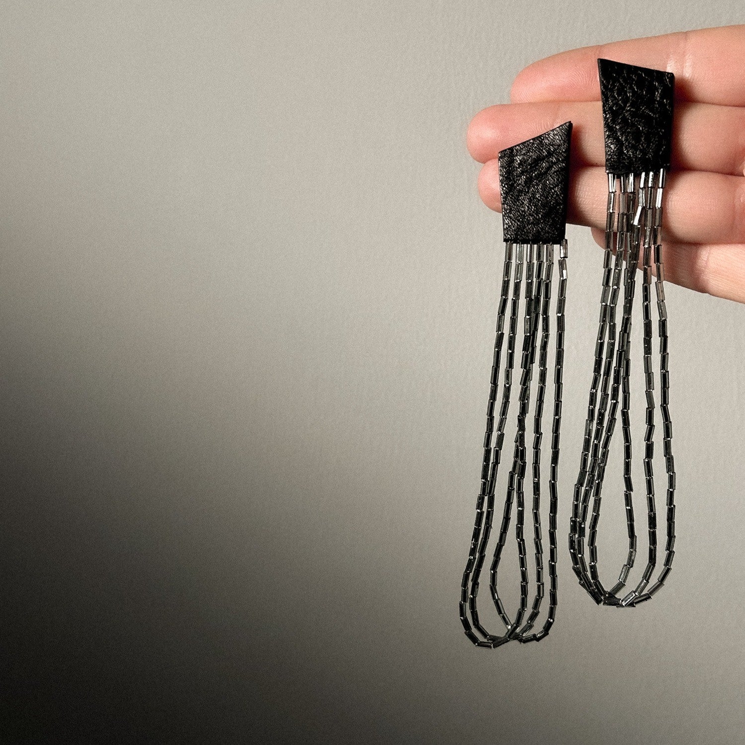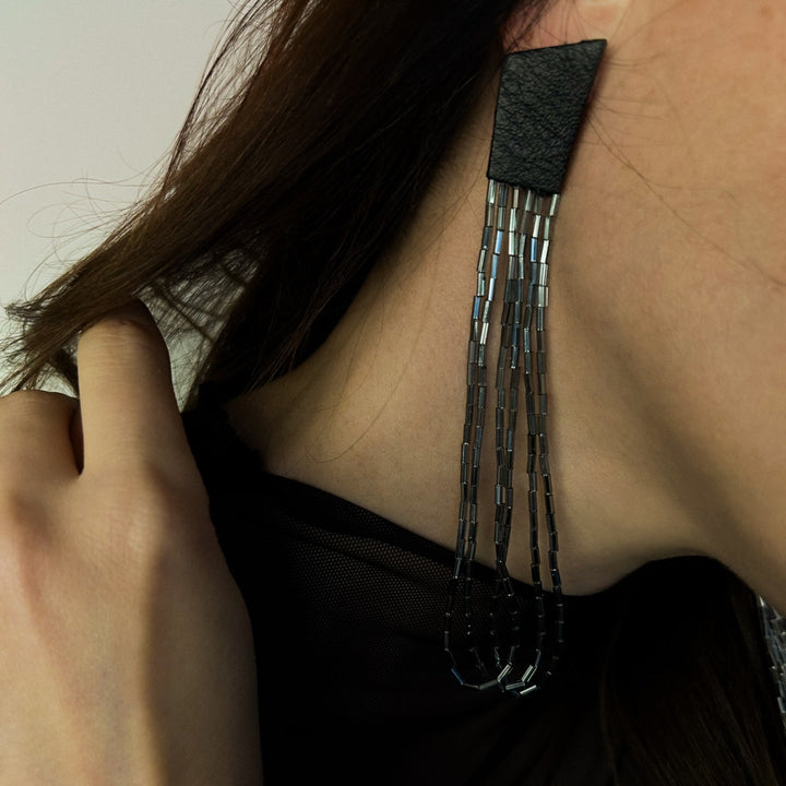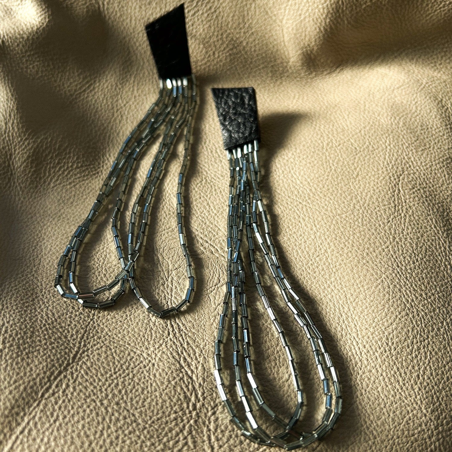 These earrings feature a geometric stud and long strings of sparkling glass beads. They are incredibly lightweight.