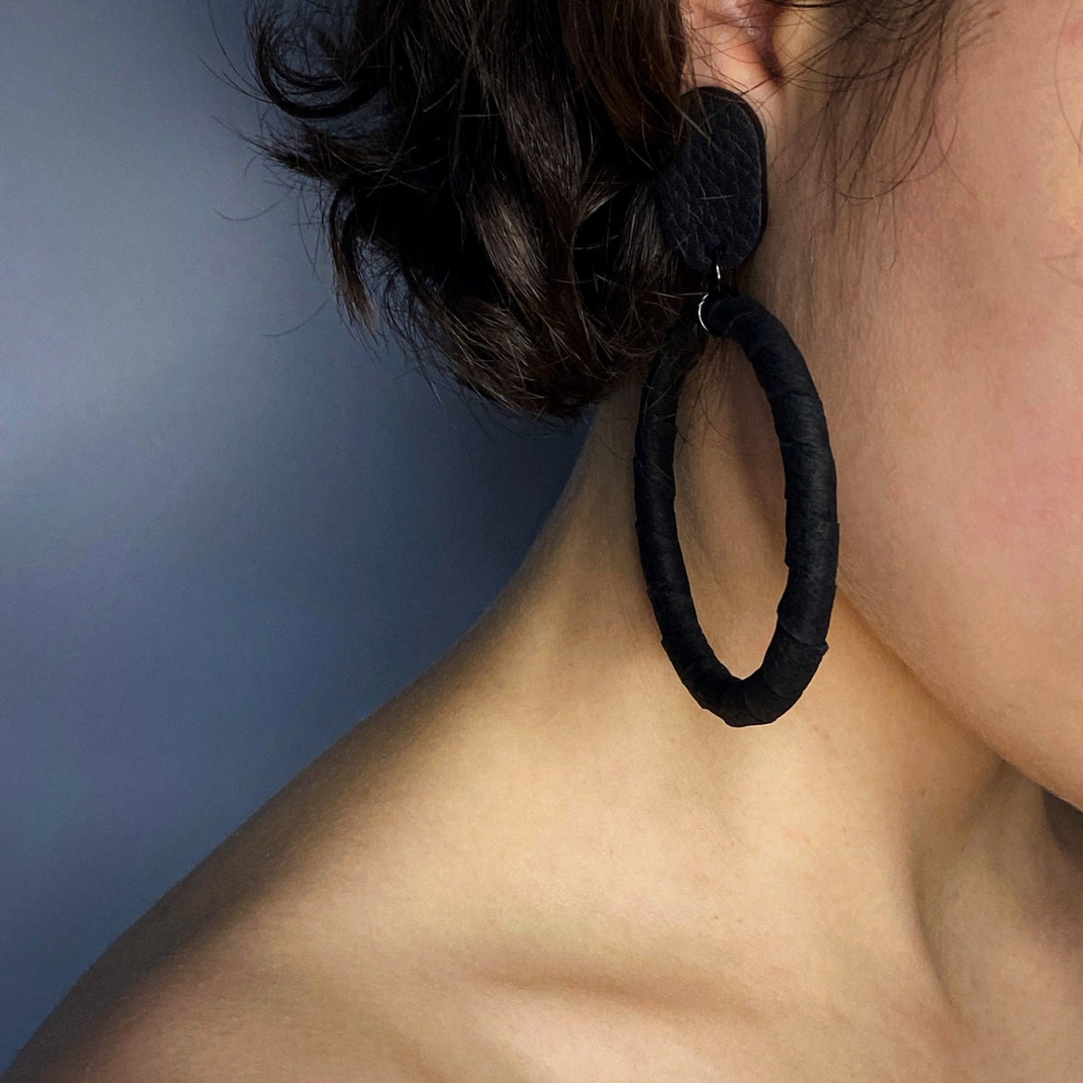 Upcycled leather. Large hoop silhouette with stud fastening. Lightweight, handcrafted construction.