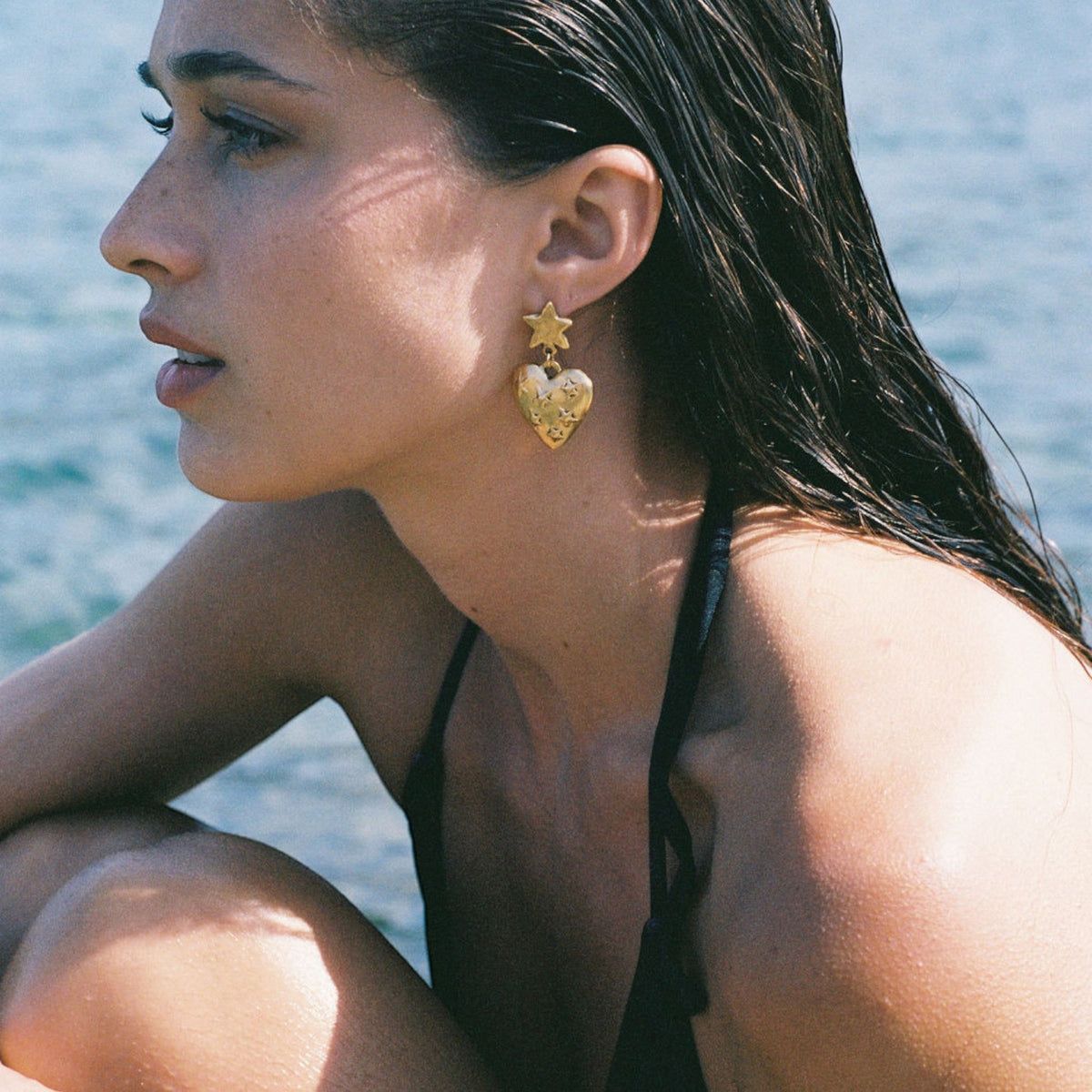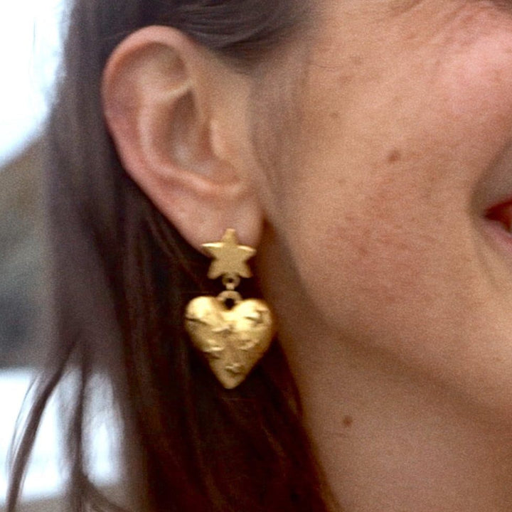 These Stella Star & Heart Earrings by Sccollection are a nostalgic and childlike accessory. The hand-carved star studs hold star-studded heart charms, creating a dreamy and confident look. They are a playful and magical statement piece for your ears.