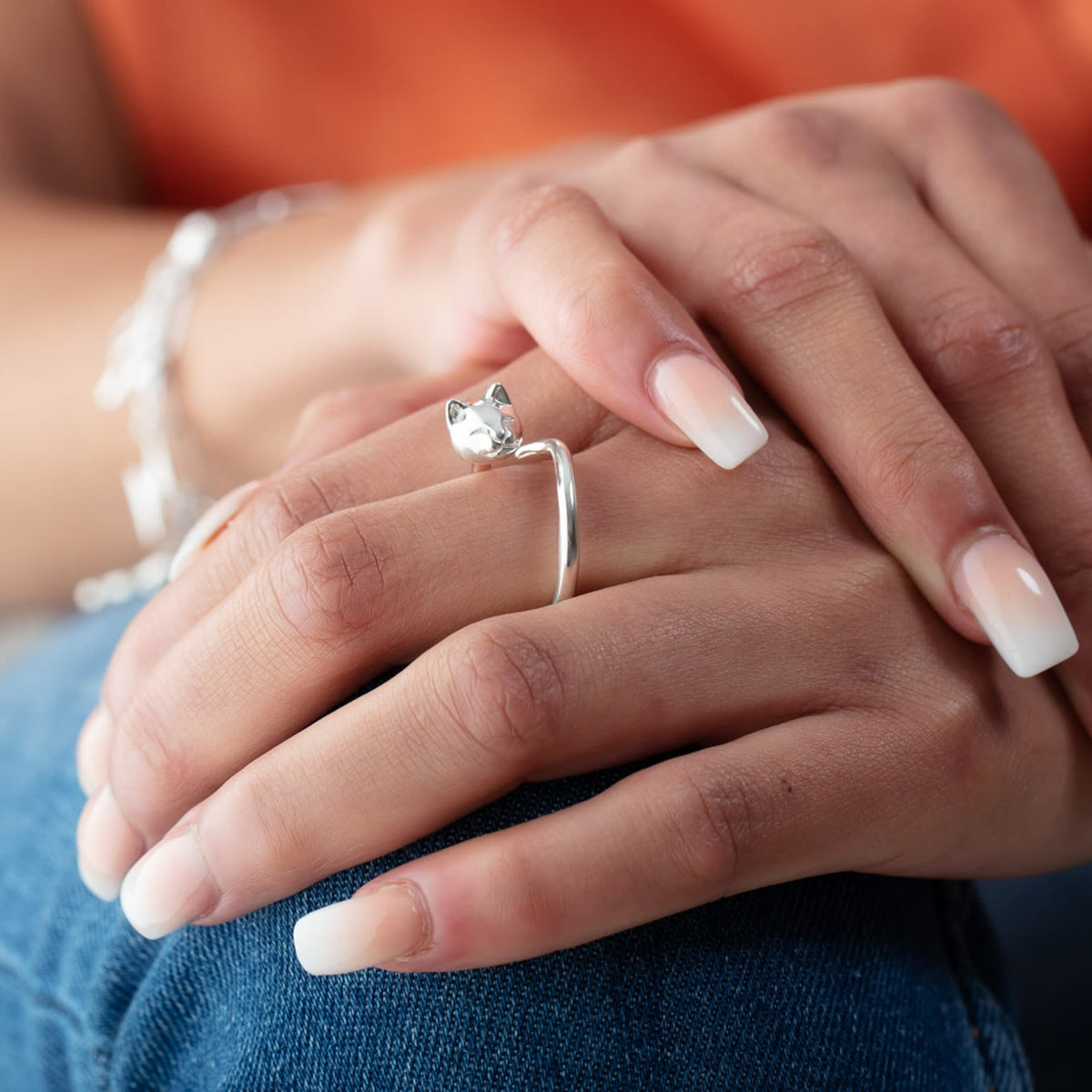 This Sterling Silver Adjustable Cat Ring by Lily Charmed is a trendy and playful accessory. This adjustable ring features a cat head and tail wrap design with a polished finish for a glossy shine. The cat symbolizes independence, courage, and patience, adding a touch of personality and fun to your jewelry collection.