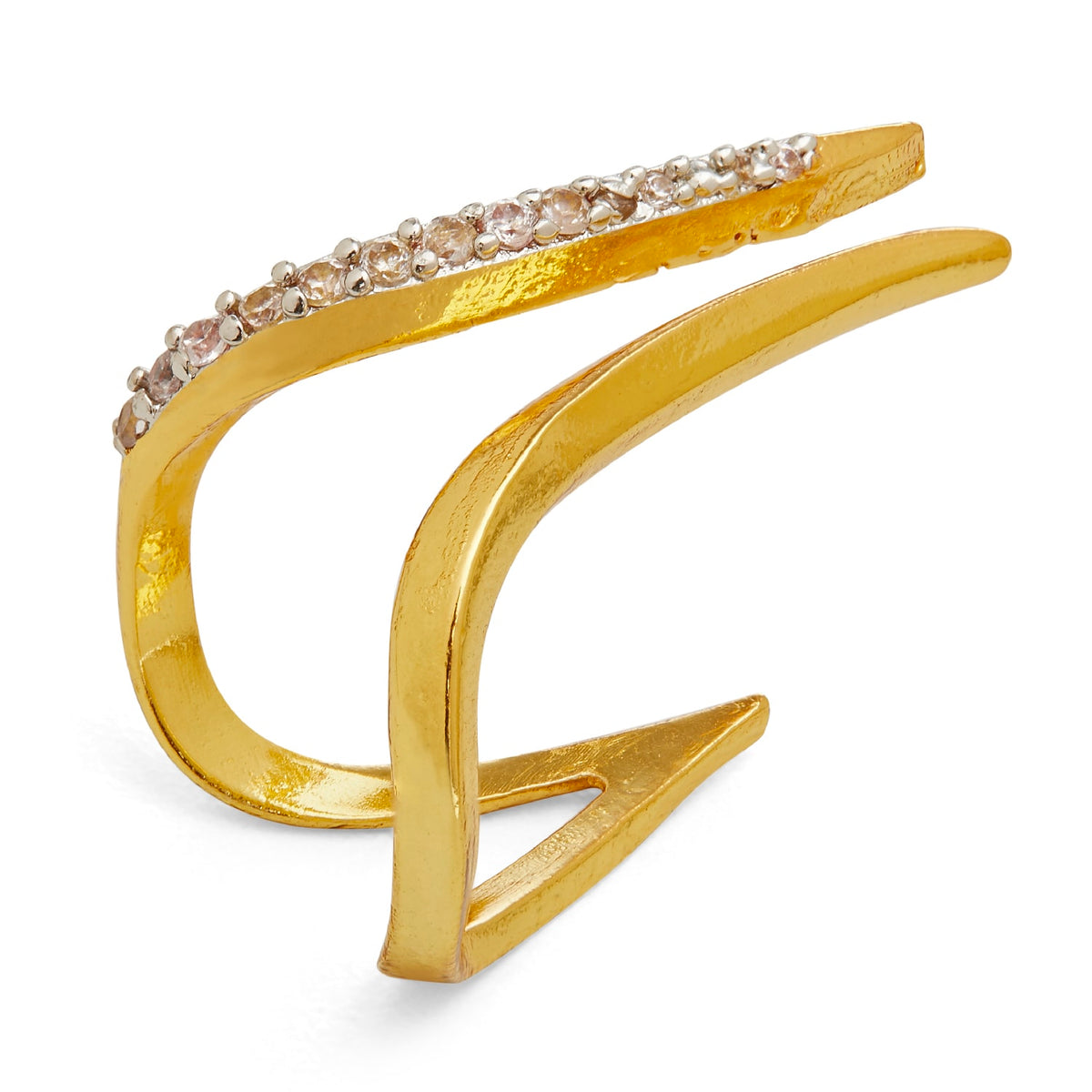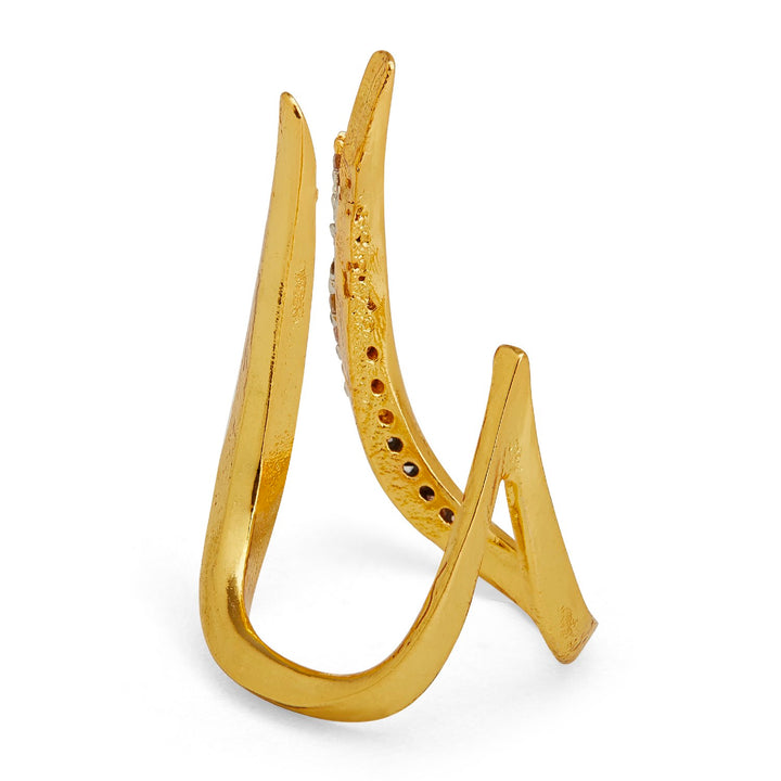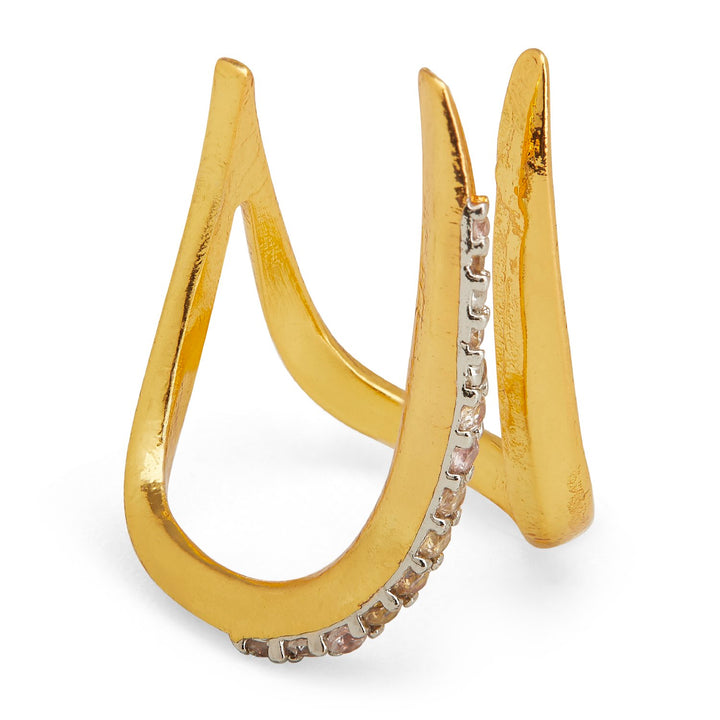 This adjustable ring is handcrafted from brass with 22k gold plating and features white cubic zirconia stones.
