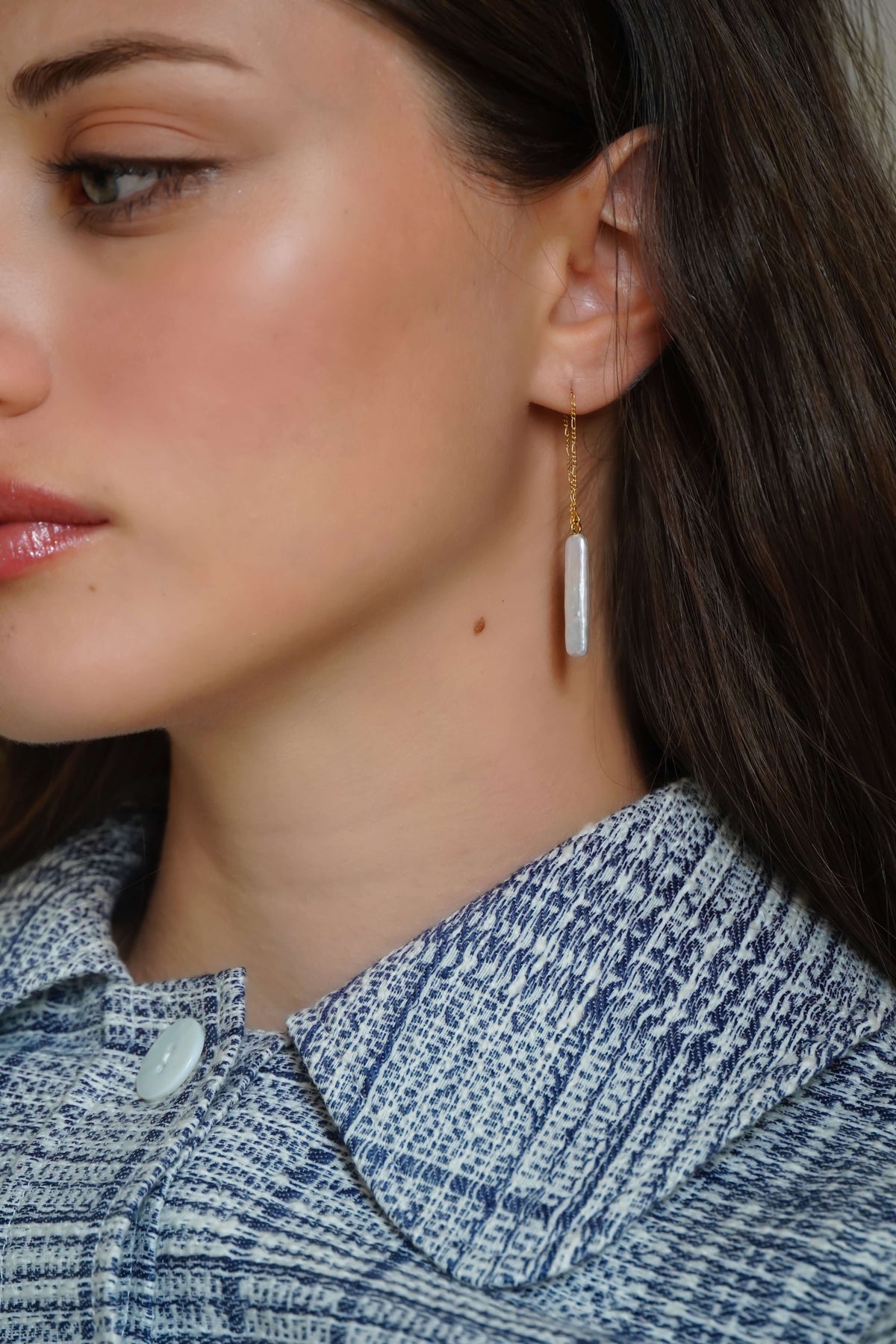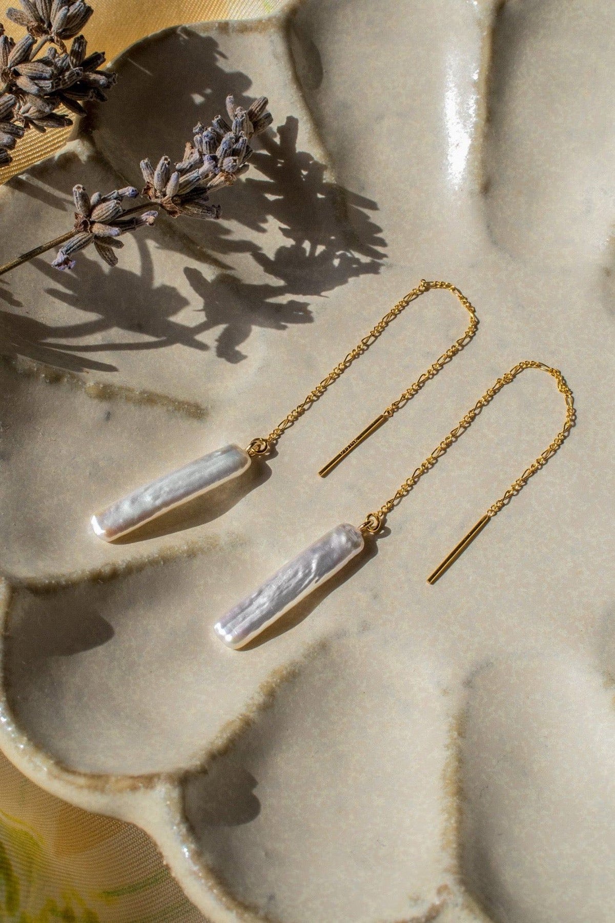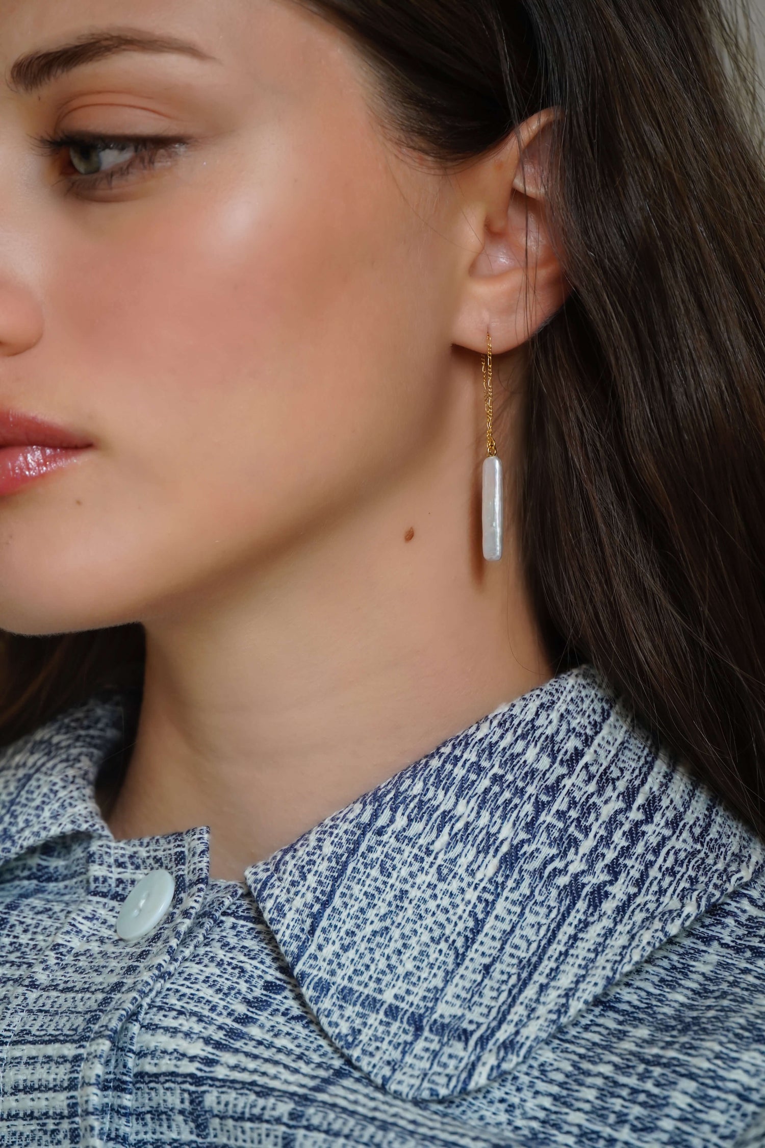 The Ella Earrings by Katy Faye are a delicately handcrafted piece that exudes timeless elegance. They feature 14k gold-filled figaro threader earrings paired with rectangular freshwater pearls, creating a graceful and sophisticated look. These hypoallergenic earrings are perfect for sensitive skin and arrive in a beautiful, plastic-free gift box, making them an ideal gift for yourself or a loved one.