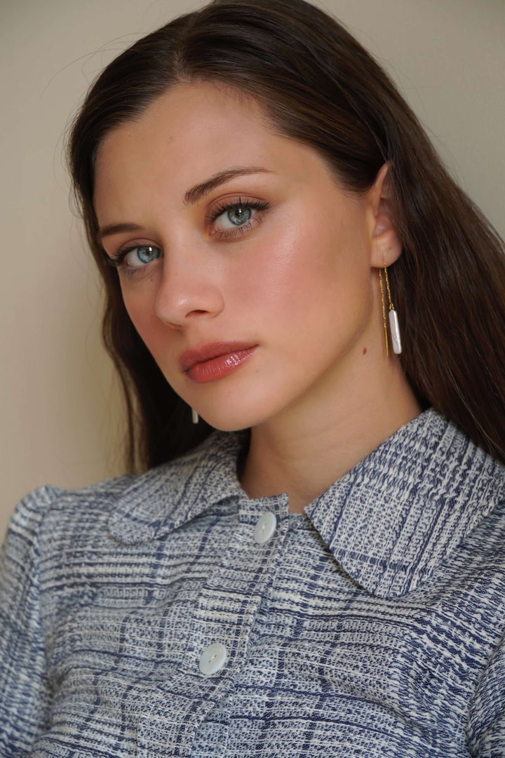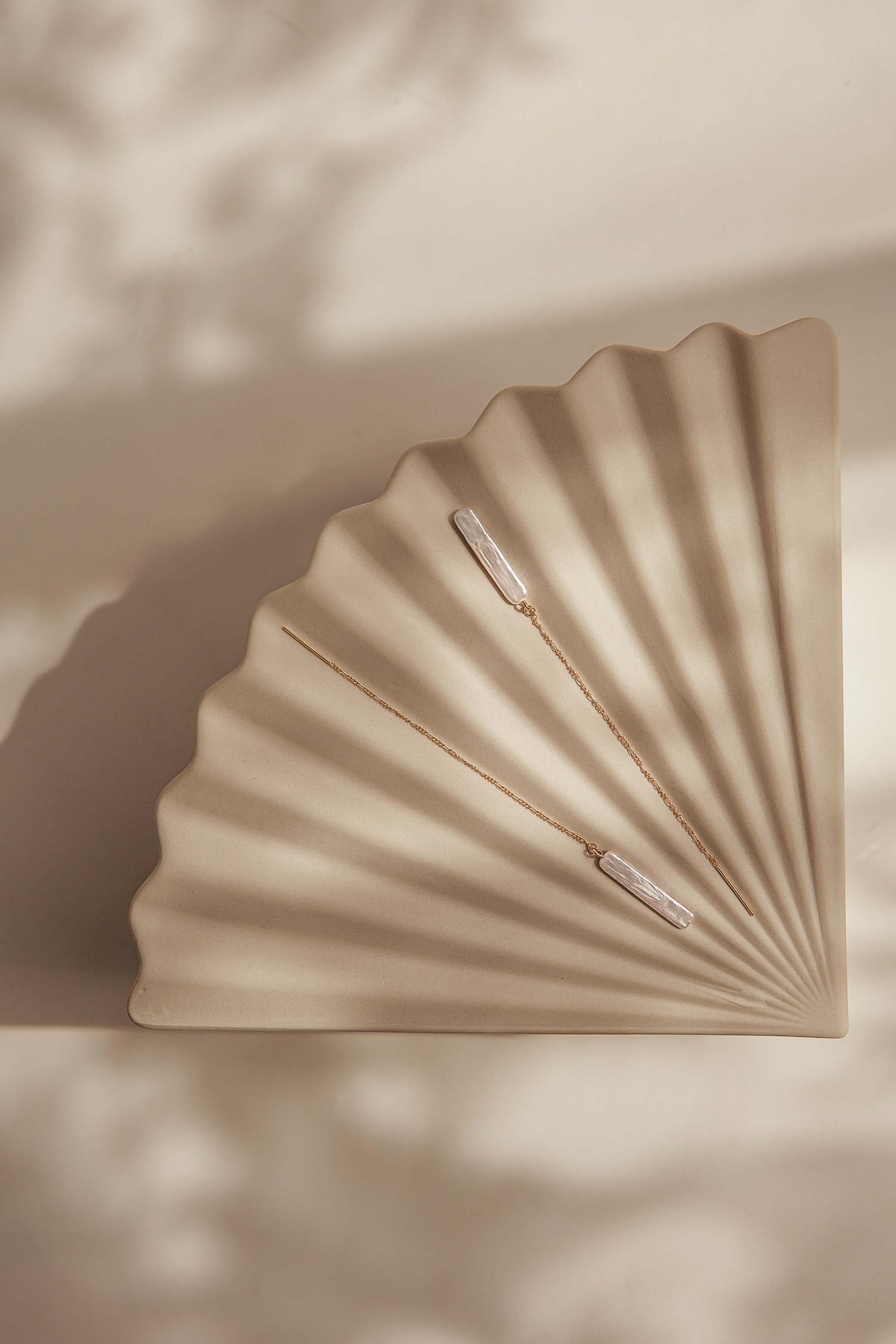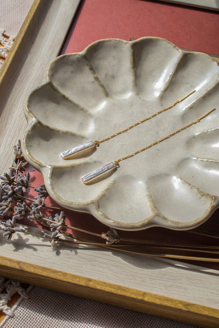 The Ella Earrings by Katy Faye are a delicately handcrafted piece that exudes timeless elegance. They feature 14k gold-filled figaro threader earrings paired with rectangular freshwater pearls, creating a graceful and sophisticated look. These hypoallergenic earrings are perfect for sensitive skin and arrive in a beautiful, plastic-free gift box, making them an ideal gift for yourself or a loved one.