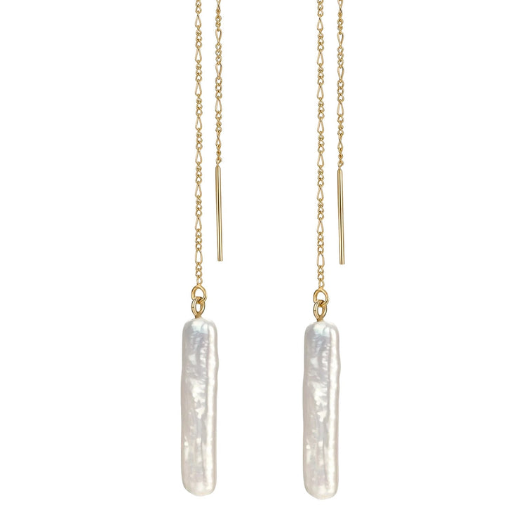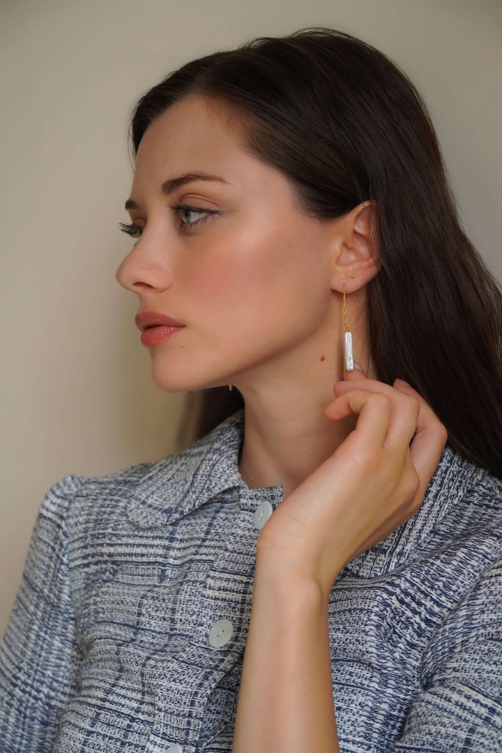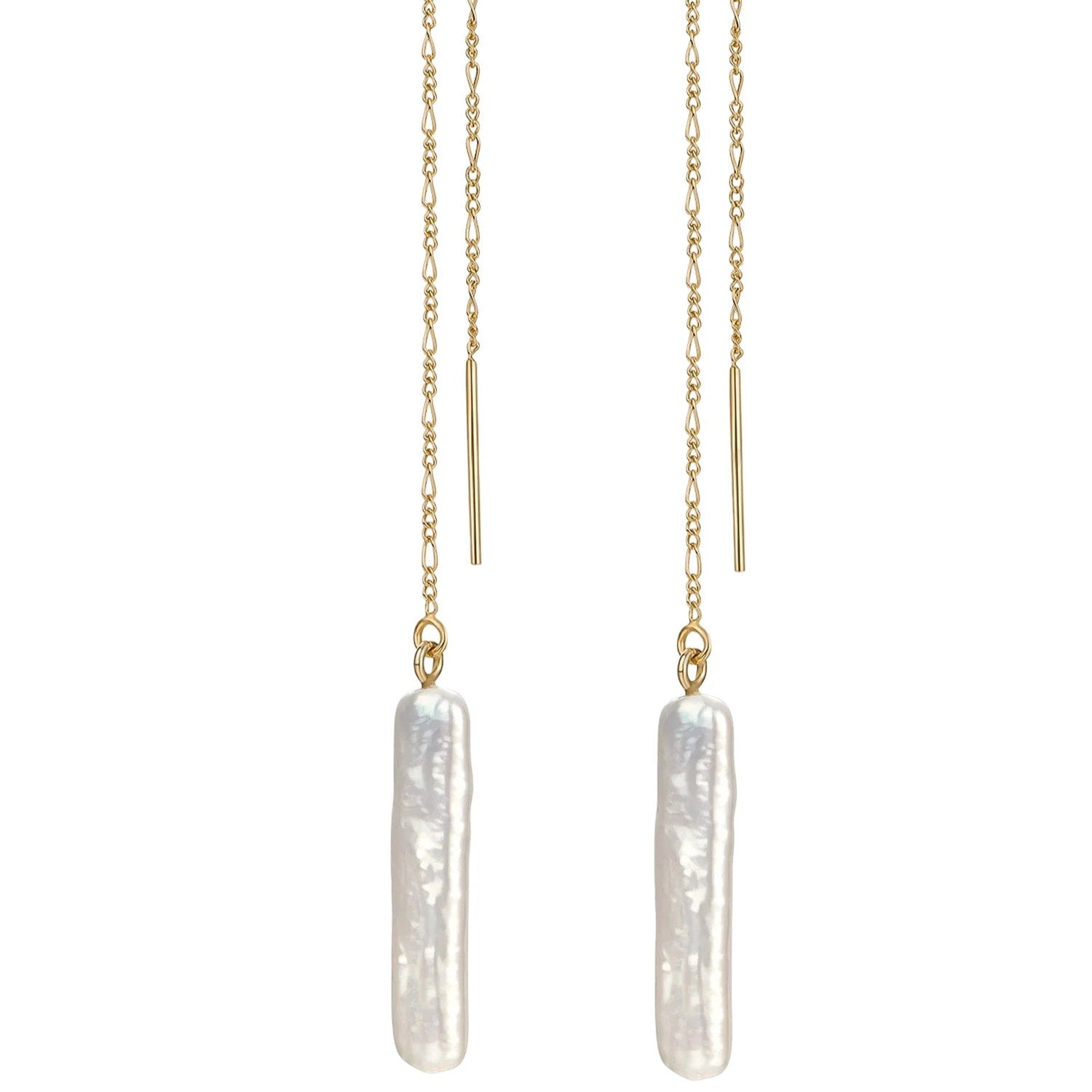 These earrings are handmade with 14k gold-filled figaro threader earrings and rectangular freshwater pearls. They are hypoallergenic.