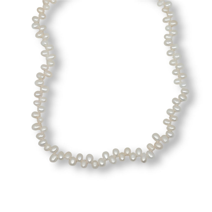 This Irregular Beaded Pearl Necklace by Ninemoo is a fresh twist on a classic. It features uniquely shaped, irregular freshwater pearls, adding a playful and unique touch to your everyday look. Each pearl is naturally distinct, celebrating the beauty of imperfection. This necklace is perfect for those who want to elevate their style with a hint of fun and individuality.