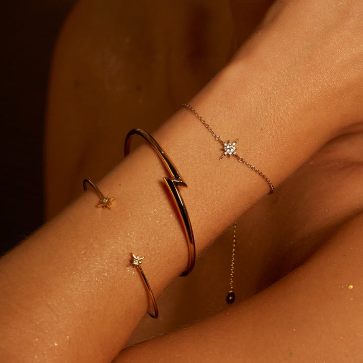 This Gold Starburst Open Bangle by Scream Pretty is celestial-inspired elegance at its finest. Adorned with sparkling cubic zirconia stars, its adjustable open design makes it ideal for stacking or gifting, adding cosmic charm to everyday wear.
