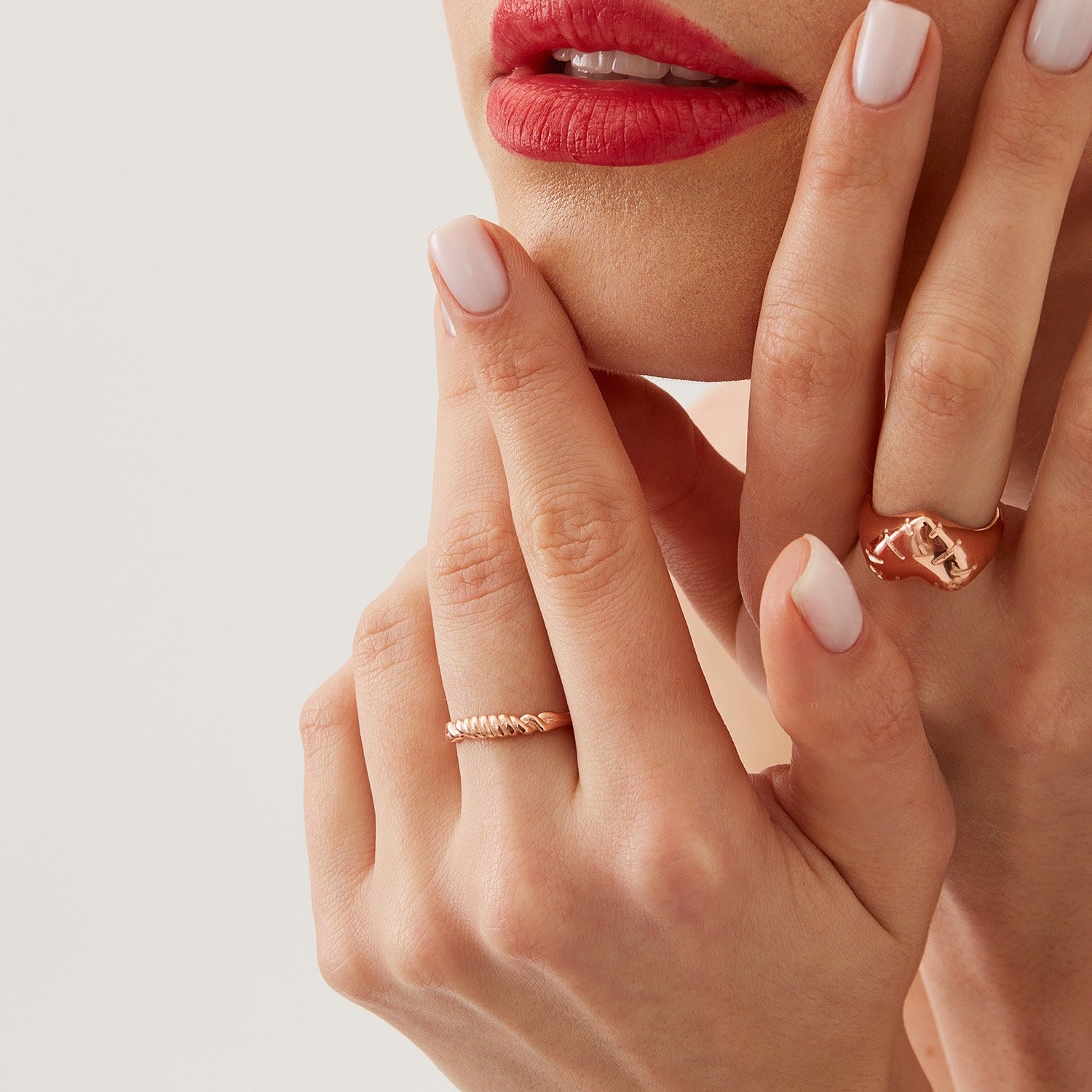 This twisted ring is made from 925 sterling silver with a rose gold finish.