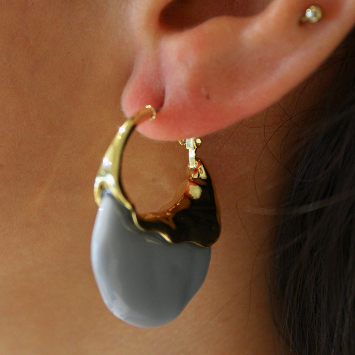 Handcrafted in Turkey, these hoops are rhodium-plated and feature a handcrafted enamel detail. They are anti-tarnish, waterproof, and hypoallergenic.