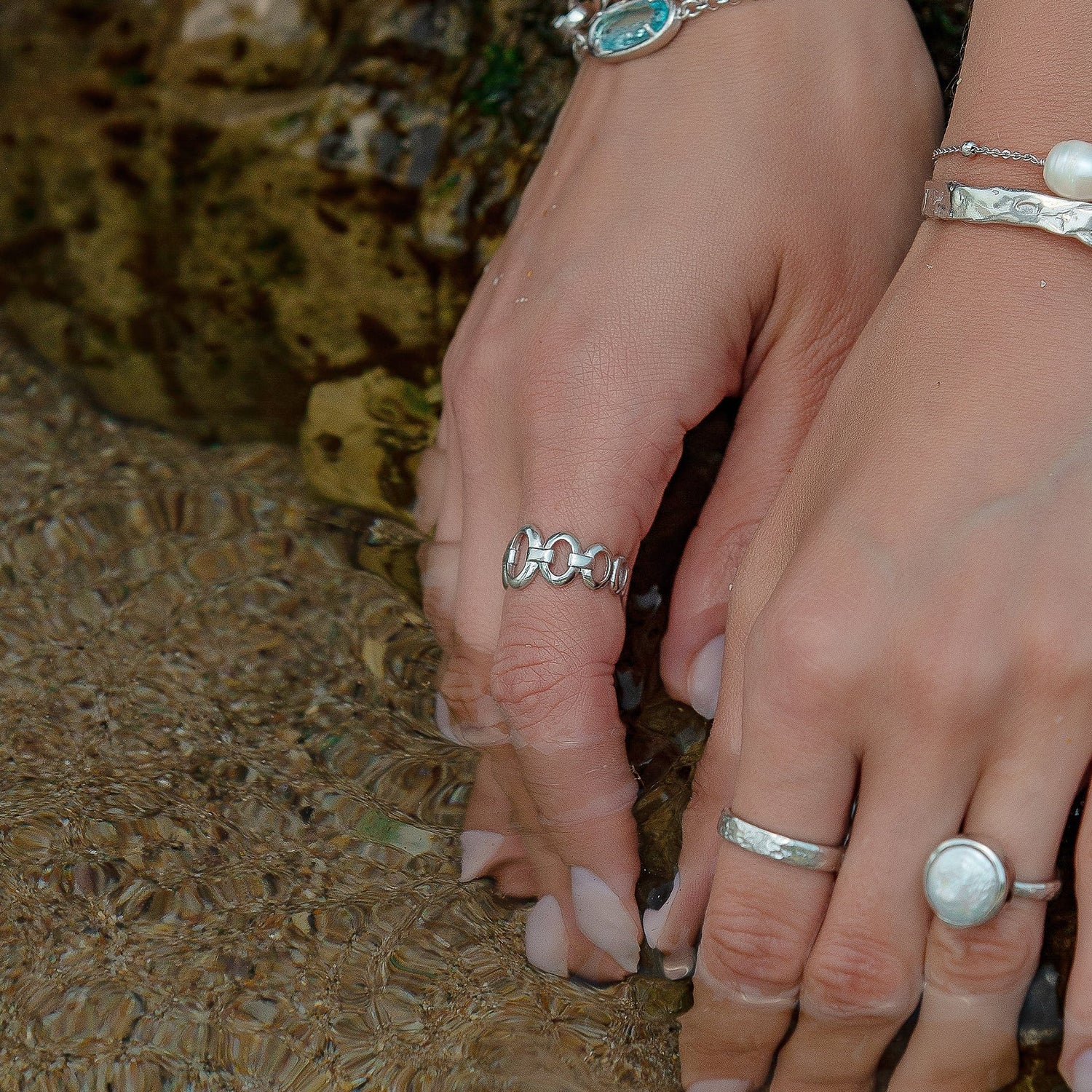 This Textured Brilliance Hammered Silver Band Ring by Mejoma is a stunning and unique statement piece that adds character and sophistication to any look. The hammered silver band has a beautifully unique texture that catches the light and adds a touch of handcrafted artistry. This ring is a timeless accessory that celebrates individuality and can be worn for any occasion, ready to shine and make a lasting impression.