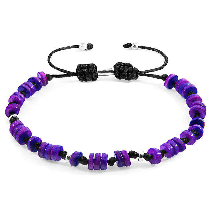 This Purple Hailey Silver & Freshwater Shell Skinny Macrame Bracelet by Anchor & Crew is a modern-minimalist piece skilfully handcrafted in Great Britain. It features genuine heishi-shaped freshwater shell beads in a vibrant purple hue. The adjustable macrame drawstring clasp is a versatile addition, allowing it to fit a variety of wrist sizes while the solid .925 sterling silver components add a touch of durability and timeless quality.