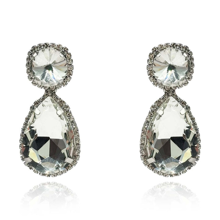These earrings are crafted with clear crystal pear-shaped drops and sparkling pave stones. The piece comes with a velvet pouch.
