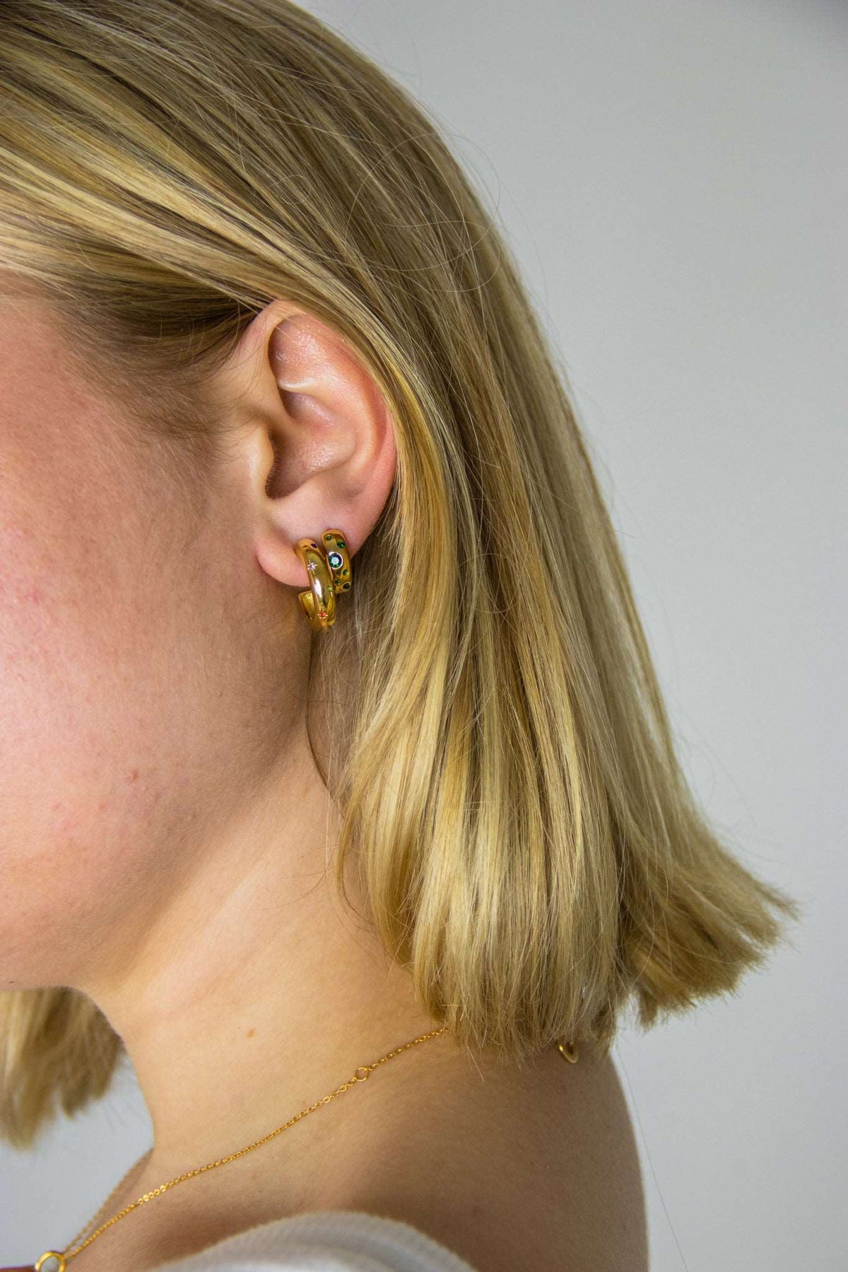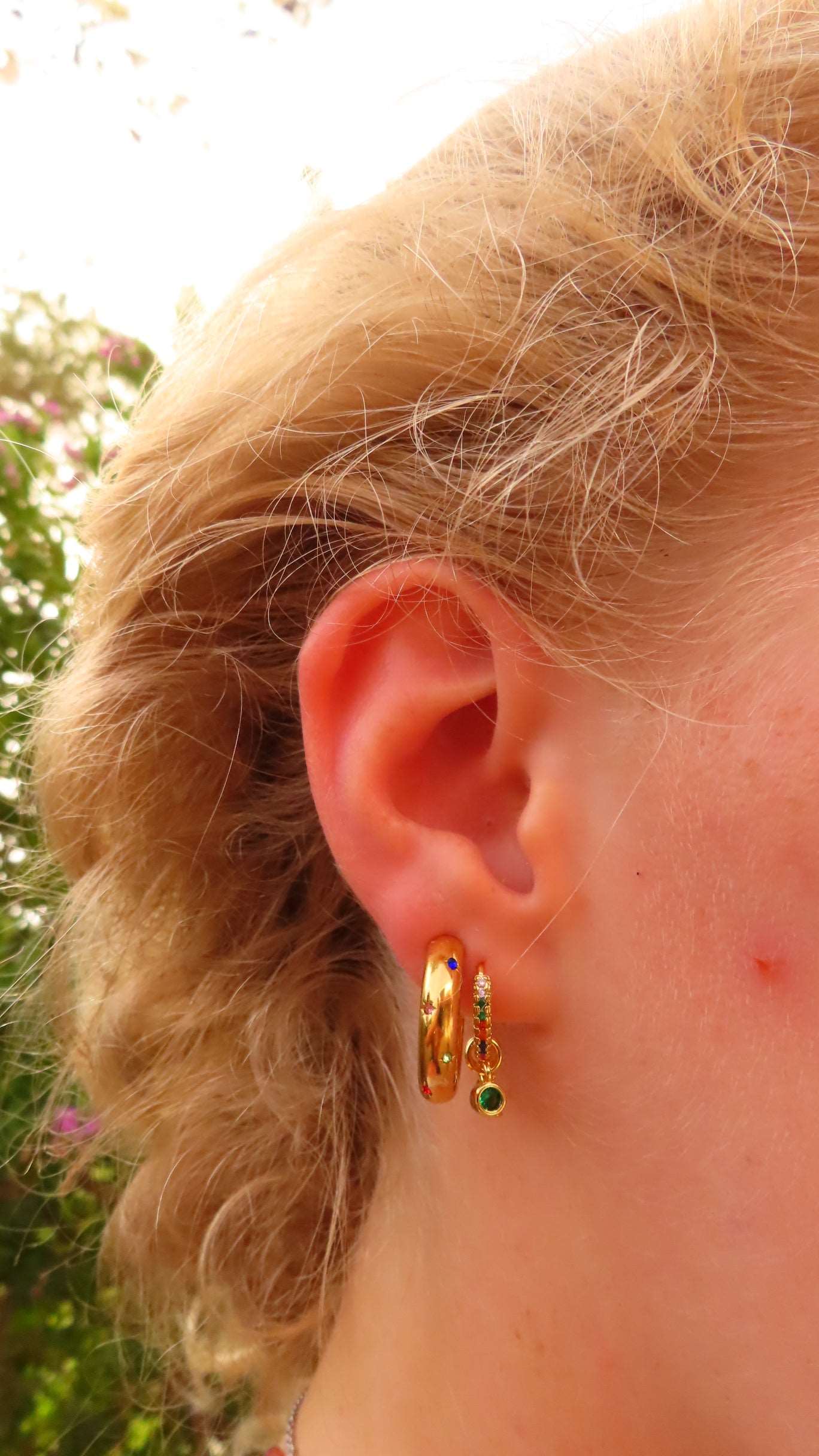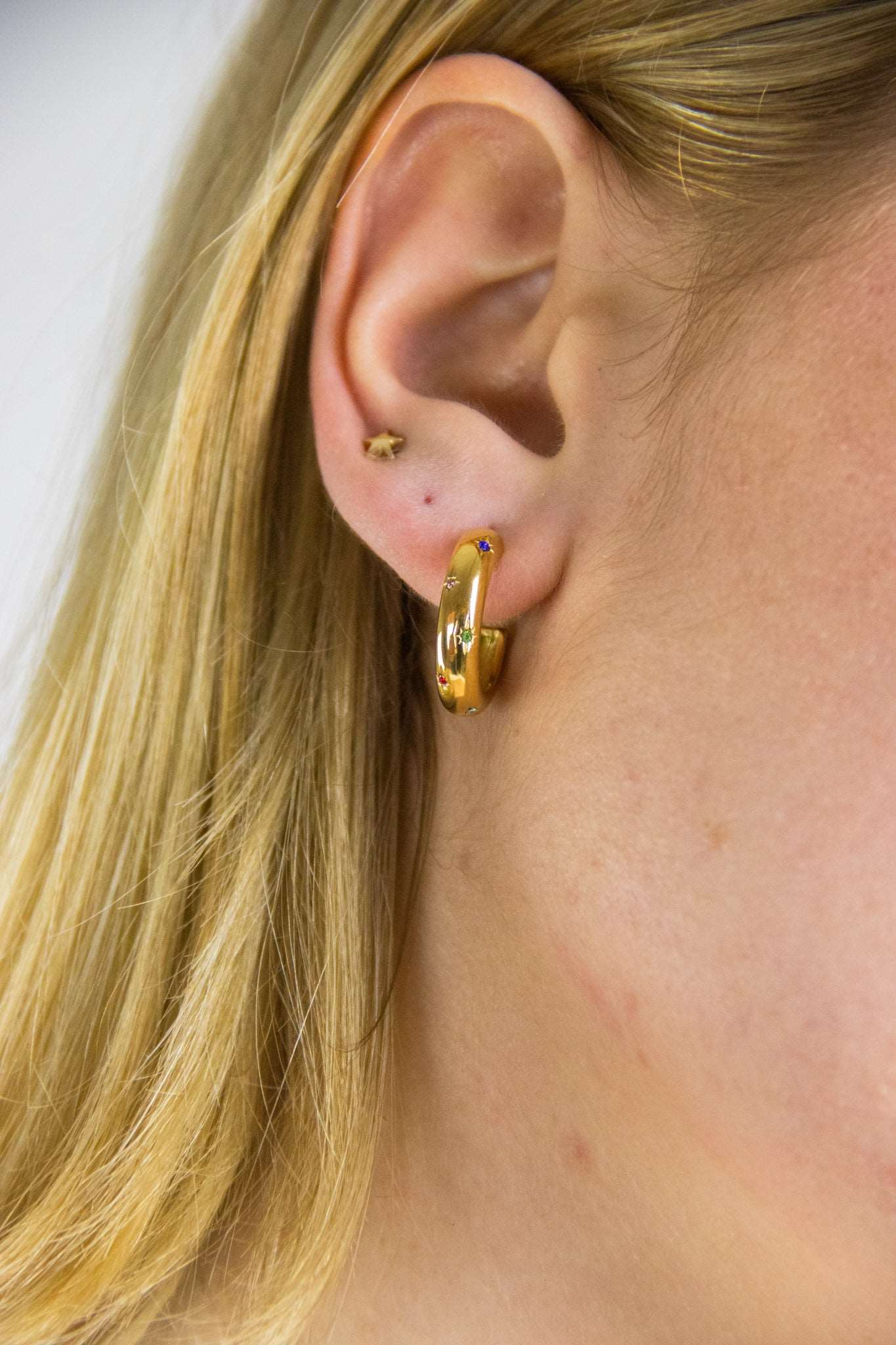 These hoops are crafted from 316L stainless steel with 18k gold plating. They feature a multi-colored star charm and are waterproof and hypoallergenic.