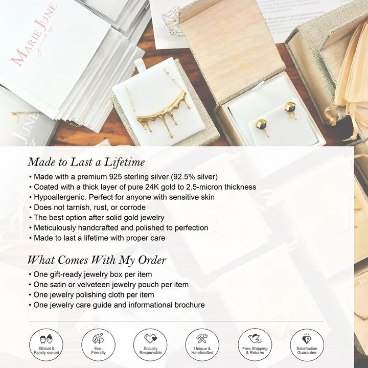 Marie June Jewelry is known for its handmade designs that emphasize uniqueness and creativity. Founded by Marie, what started as a small Etsy shop has since grown into a full-fledged design studio in Old City, Philadelphia. Marie’s signature dripping designs are inspired by the concept of viscosity, capturing the flowing nature of molten metals in solid form. Each piece is crafted with the goal of being a conversation starter. The brand places a strong emphasis on sustainability and social responsibility.
