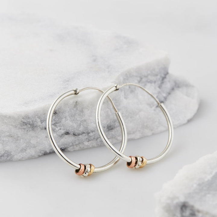 These Maharani Spin & Wish Silver Hoop Earrings by Charlotte’s Web Jewellery are tactile treasures inspired by Indian royalty. Designed with removable spinning beads in mixed metals, they draw on the soothing tradition of Tibetan spinning rings. Playful yet luxurious, they embody both cultural richness and stress-relieving calm.