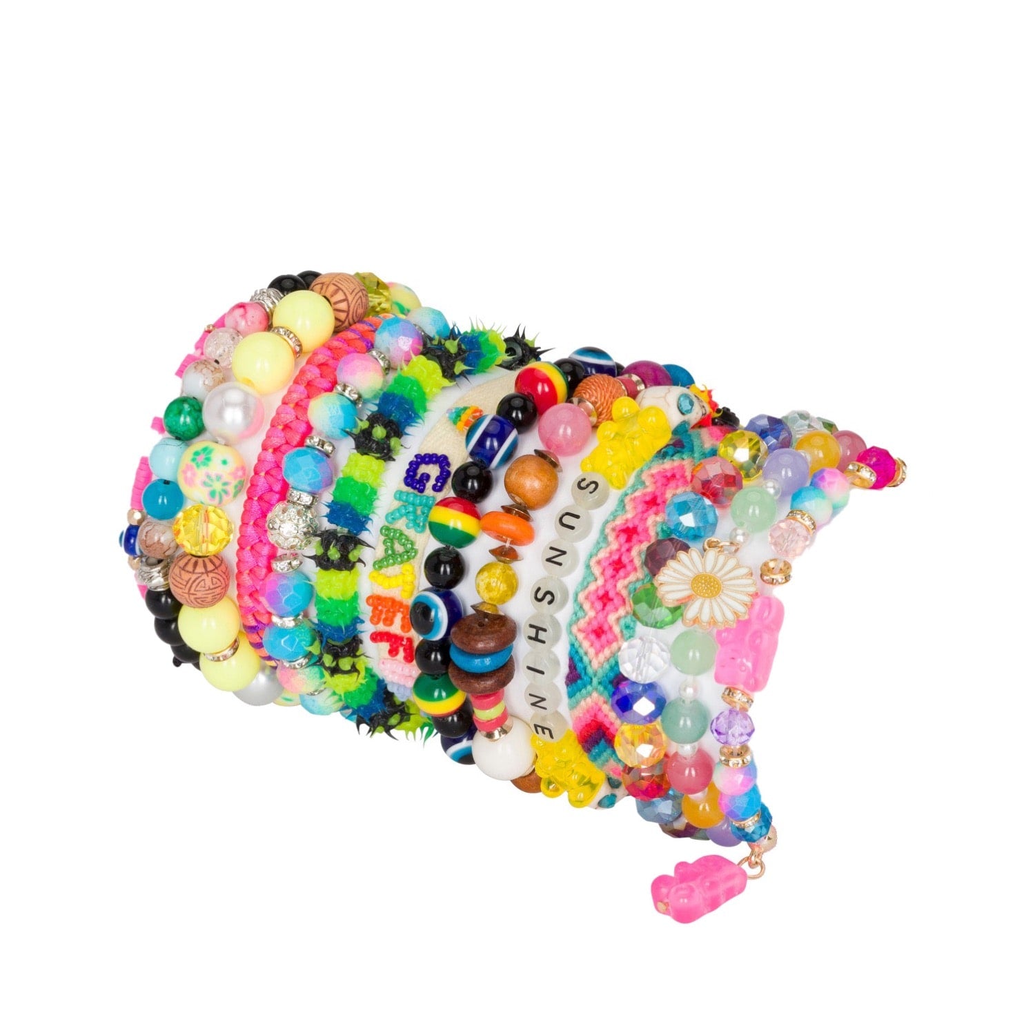 Cotton and nylon thread; glass, wood, clay, and plastic beads; metal charms; elastic-threaded and adjustable slide closures; set of 14 assorted bracelets.