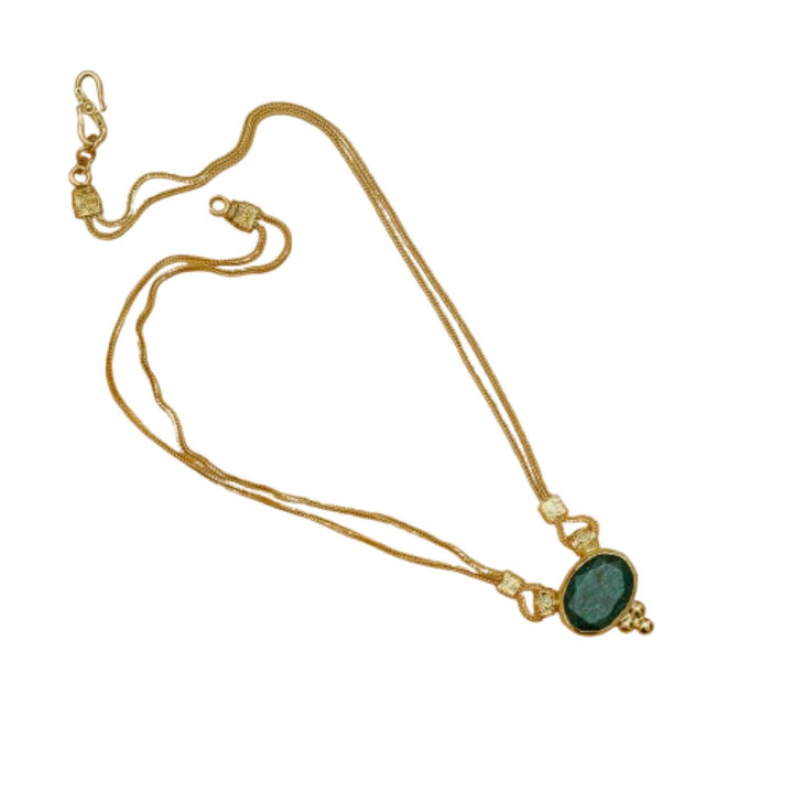 This necklace is crafted from brass metal with a 21-karat gold-plated lacquer coating. It features a double chain with an oval emerald stone pendant and a gold circled trio.