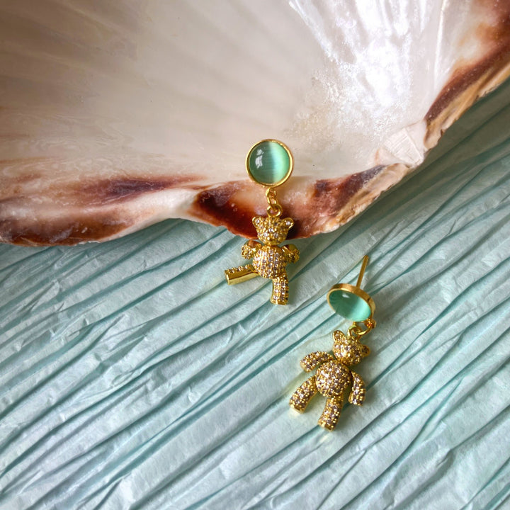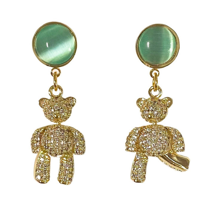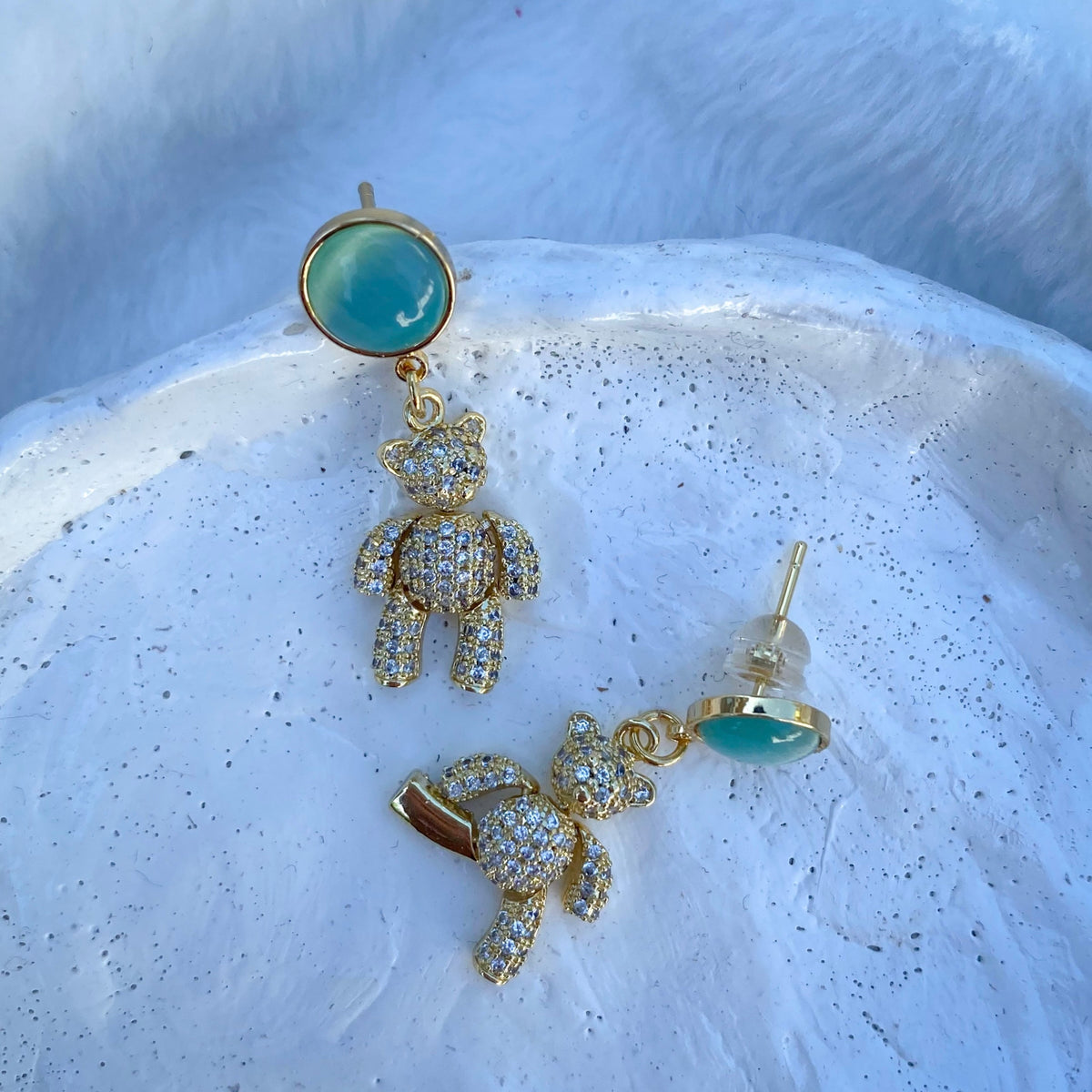 These earrings are crafted from unspecified metal and feature aquamarine blue cat's eye stones and a zircon-encrusted bear.