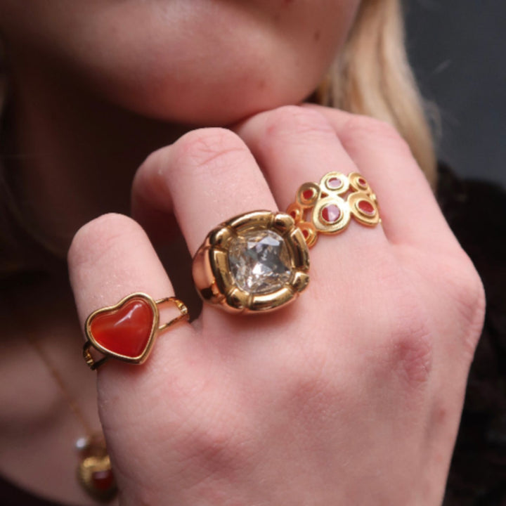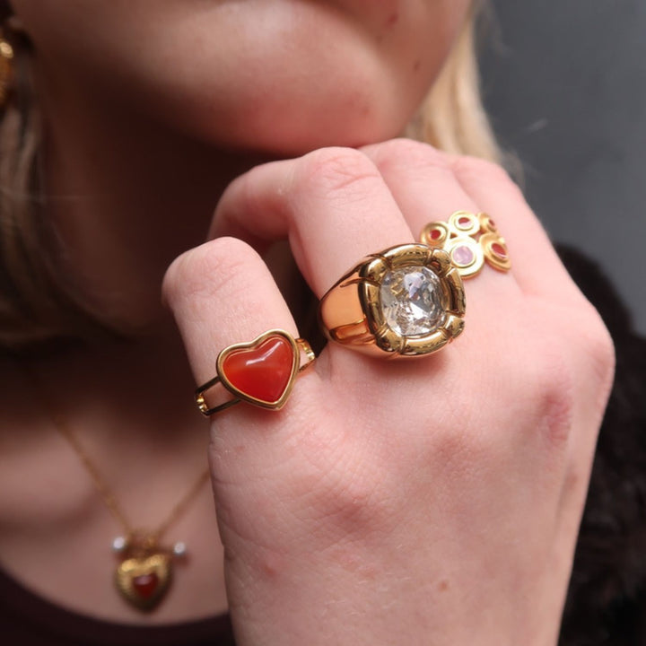 This adjustable ring is crafted from 18k gold-plated stainless steel and features unique red gemstones. It is both waterproof and hypoallergenic.