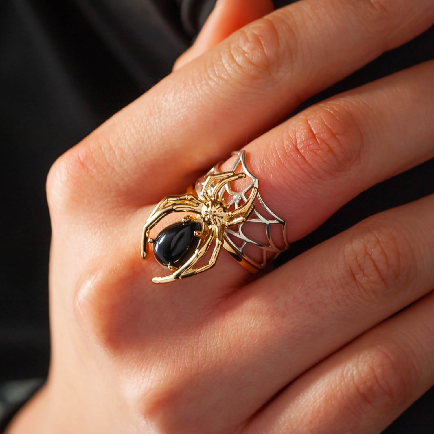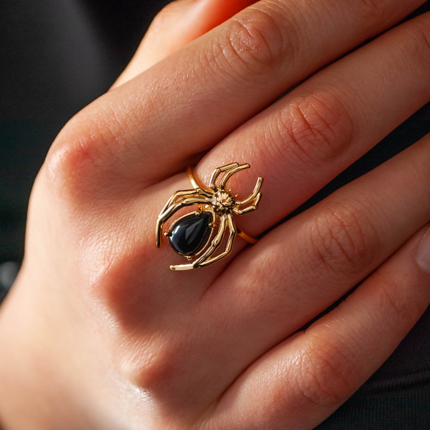 This Gold Vermeil Spider & Black Onyx Stacking Ring by Marie June Jewelry weaves together mystery, strength, and elegance. The spider motif, a symbol of creativity and resilience, encases a natural black onyx cabochon—a stone long associated with grounding and protection. The luminous gold vermeil band contrasts beautifully with the deep black gemstone, creating a piece that is both edgy and refined. Designed for stacking or wearing solo, it offers versatile styling with symbolic depth.