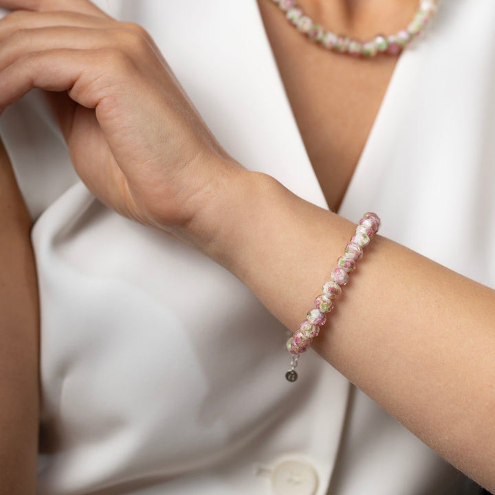 The Summer Rose Glass Beaded Bracelet - Gold by Gold Trip is a playful and elegant piece that's perfect for summer. It features sparkling, faceted glass beads with a sweet rose pattern and hints of gold flakes that catch the light. This bracelet adds a dash of fun and shines whether you're dressing up or keeping it casual.