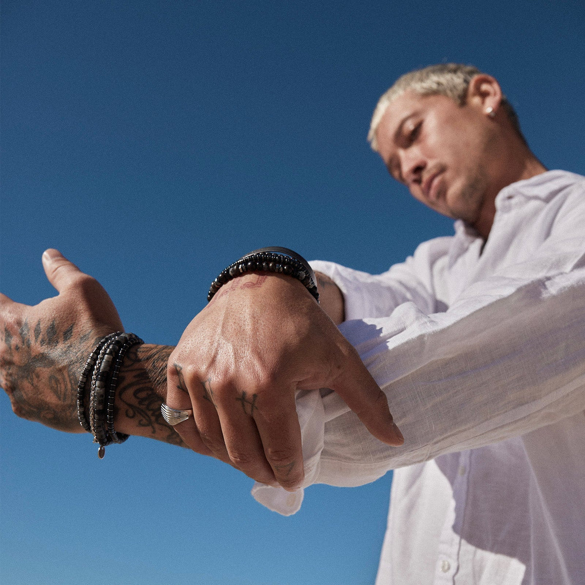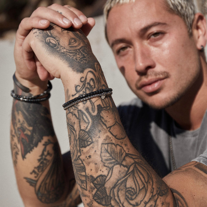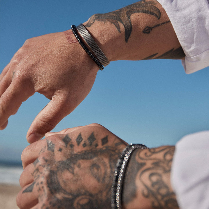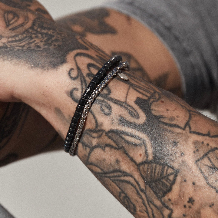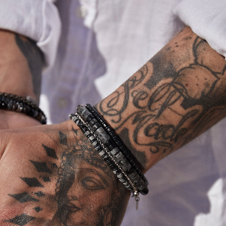 This Roman Men's Bracelet by Arms of Eve is a classic and dapper accessory, perfect for the modern man. It strikes a balance between rugged and refined, making it a versatile piece that complements both casual and more polished looks. The combination of black agate and steel beads gives it a masculine yet sophisticated feel, embodying a sense of quiet strength and timeless style. This bracelet is designed to be a reliable staple, ready to be worn alone or stacked for a bolder statement.