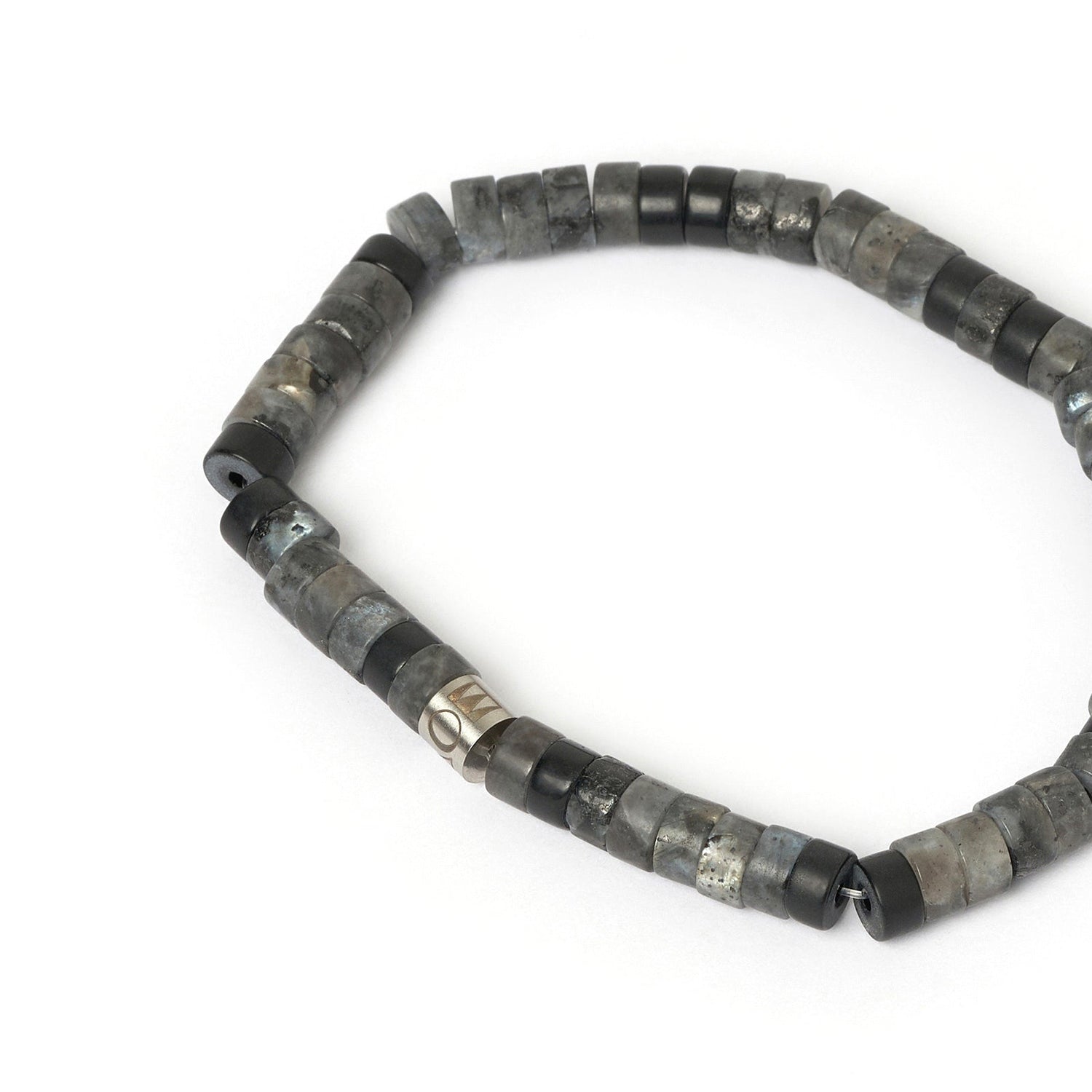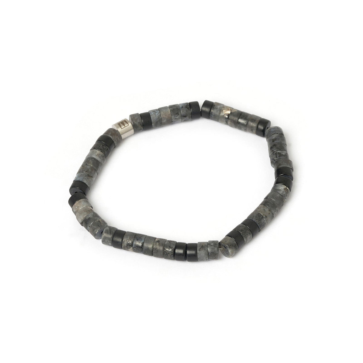 This bracelet is crafted from a stainless steel base and features black and grey beads. It is lead and nickel-free and adjustable.