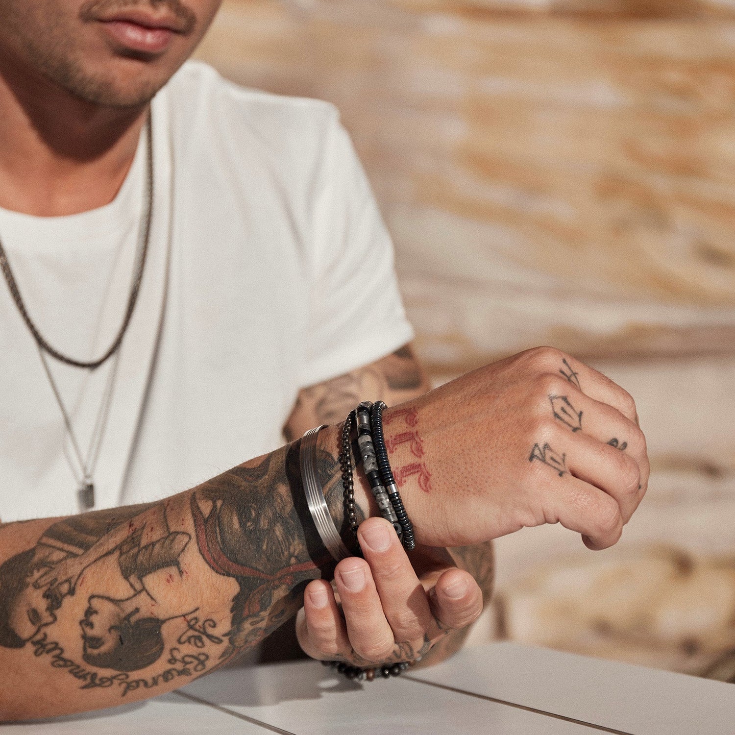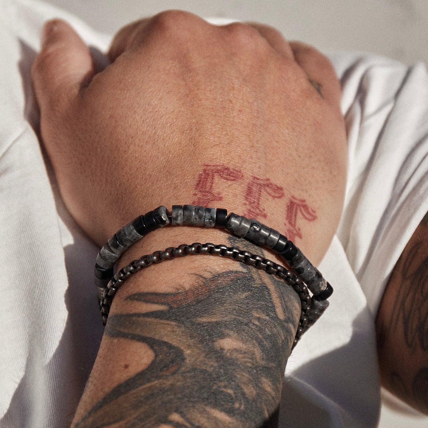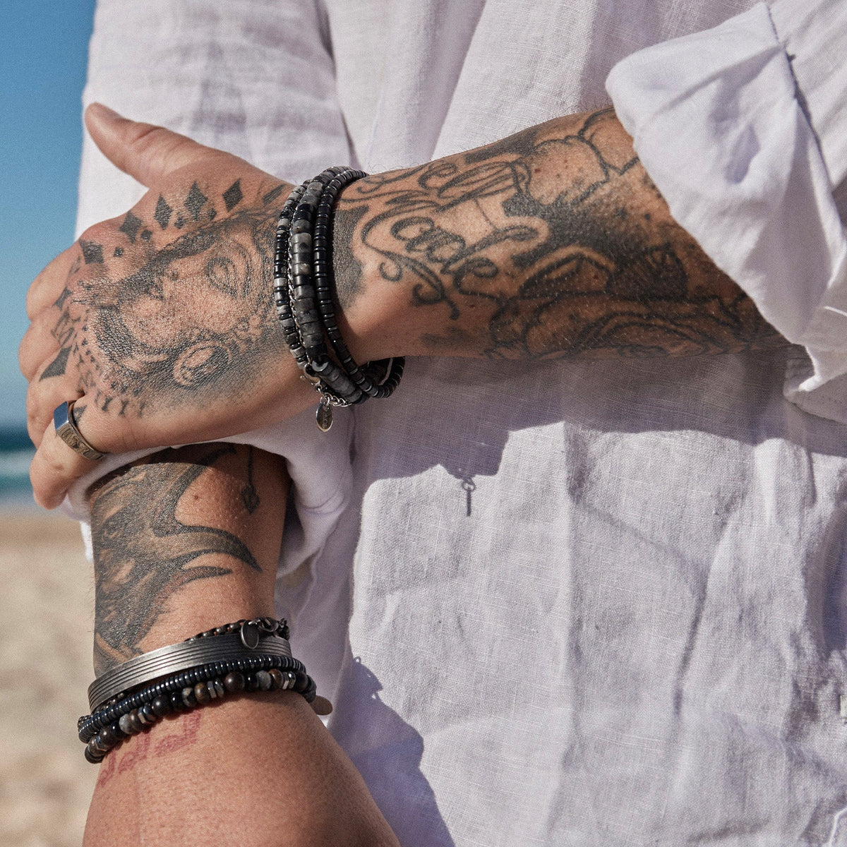 This Jamie Men's Bracelet by Arms of Eve is a bold, fashion-forward accessory designed to make a statement. The incredibly cool marled black and grey beads give it a distinctive look that is both modern and versatile. Crafted from a durable stainless steel base, this bracelet is built to last. Its adjustable design ensures a comfortable fit for most sizes, making it an ideal accessory for anyone looking to elevate their style with a touch of unique flair.