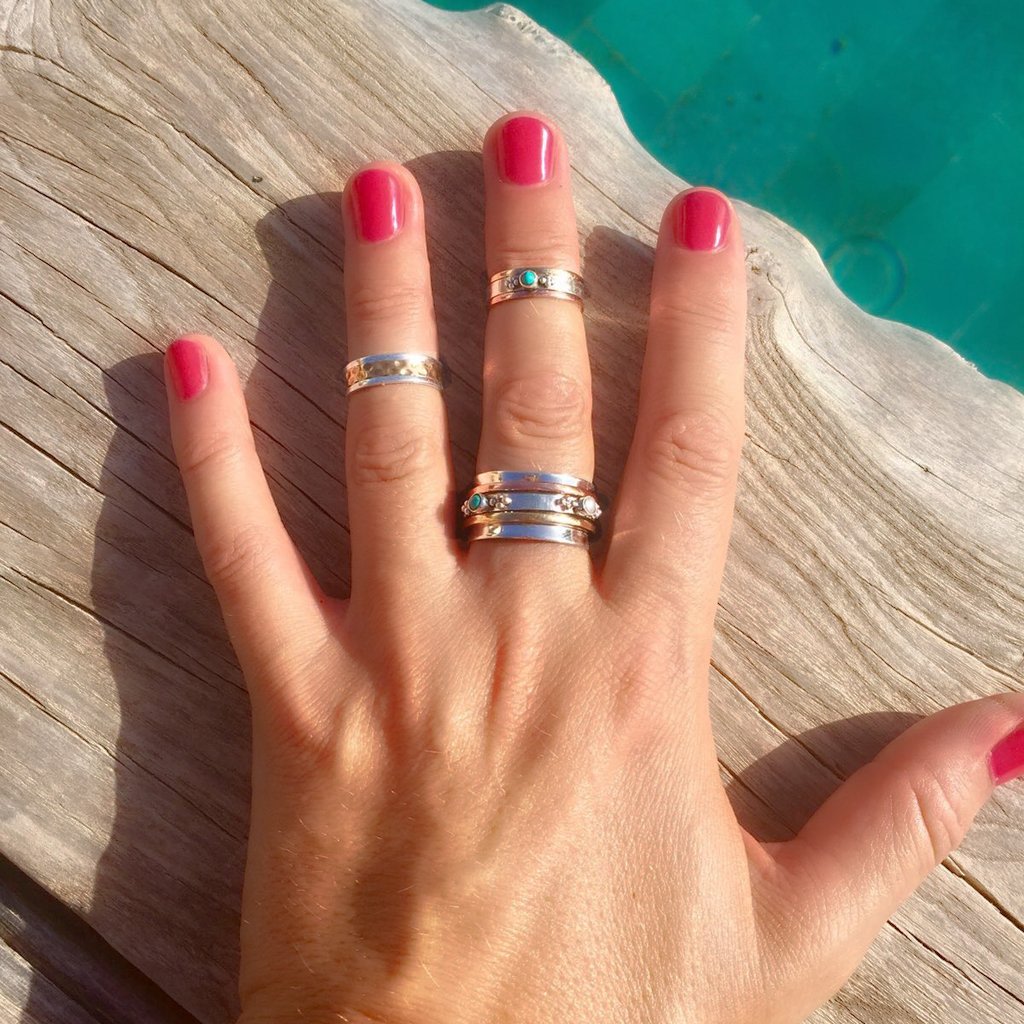Handmade in sterling silver, brass, and copper. Set with turquoise gemstone (approx. 0.2cm). Adjustable fit.