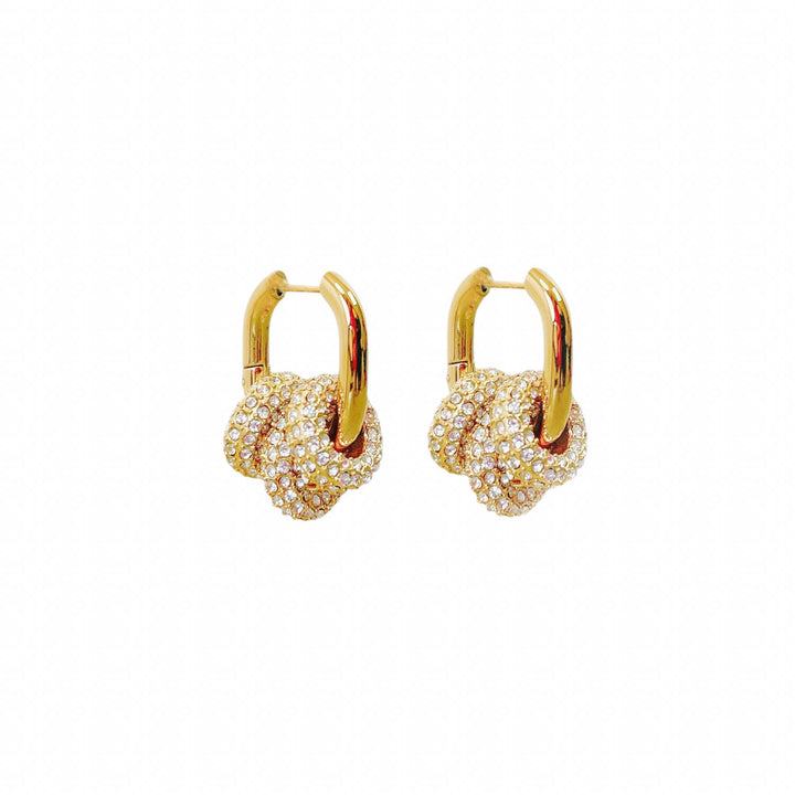 These earrings are 18K gold plated and are adorned with Zircon crystal spheres. They have a square shape.