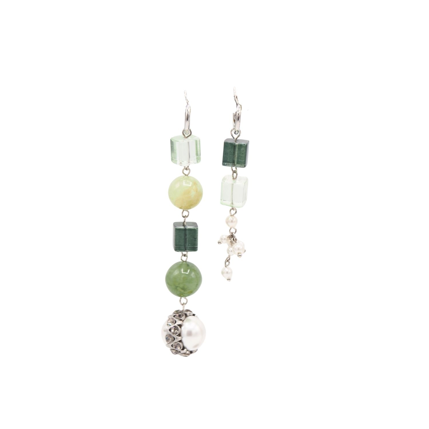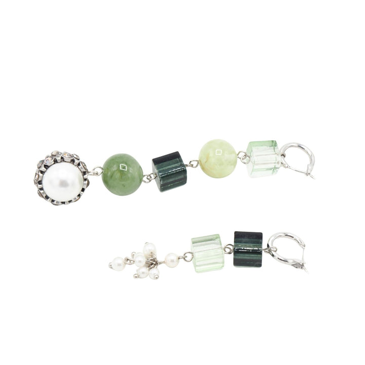 These Sisters Earrings - Green by Sita Nevado are an asymmetrical pair, perfect for those who love unique and artistic accessories. One earring is a mini creole hoop, while the other is a longer drop earring with crystal pendants. Made with brass with protection, gold-plated brass, crystal, and a pearl with a crystal core, they add a striking visual element. The elegant green hue makes these earrings a great choice for any occasion where you want to stand out.