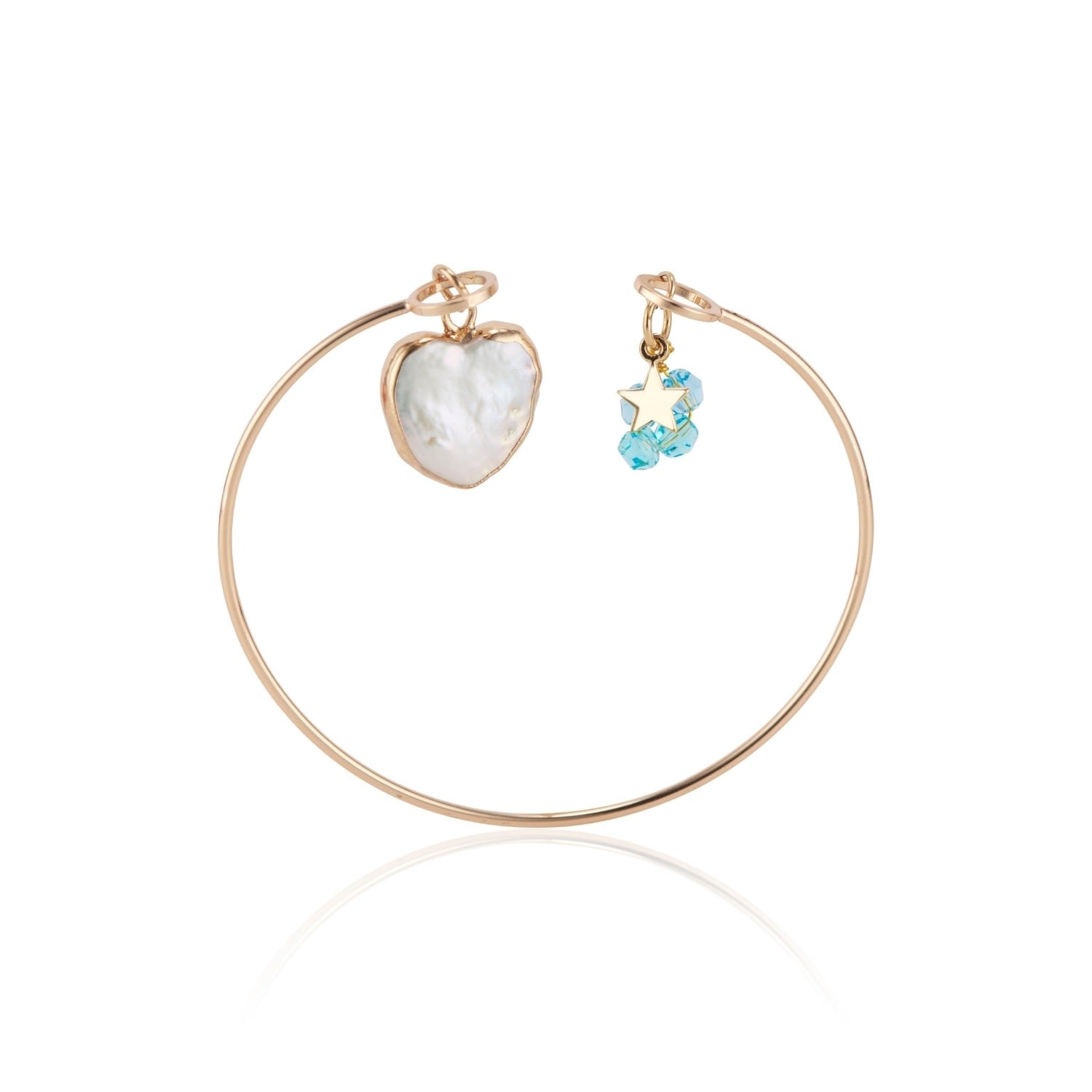 This cuff bracelet is crafted from gold-plated brass. It features a natural freshwater pearl heart charm and a 14k gold-plated star charm with Swarovski crystals.