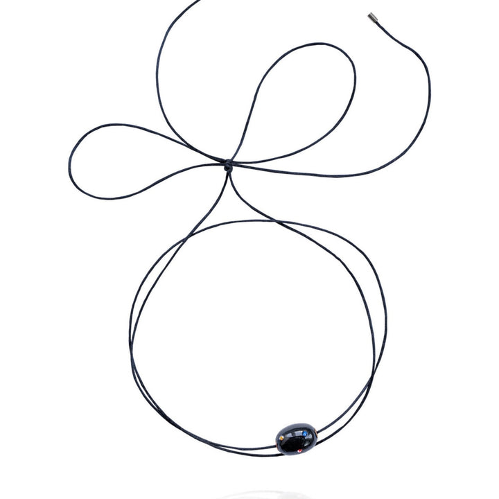 This Lily Tie Necklace by Saule Label in Jet Raven is a minimal, delicate, and quietly magnetic accessory. It features a hand-painted bead with shimmering Austrian crystals, threaded onto a double-length satin cord. The adjustable cord allows for versatile styling, from a simple knot to a bow, making it a piece that is easy to style but hard to forget. This necklace wears like a whisper, making a subtle yet powerful statement.