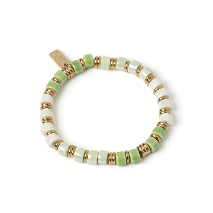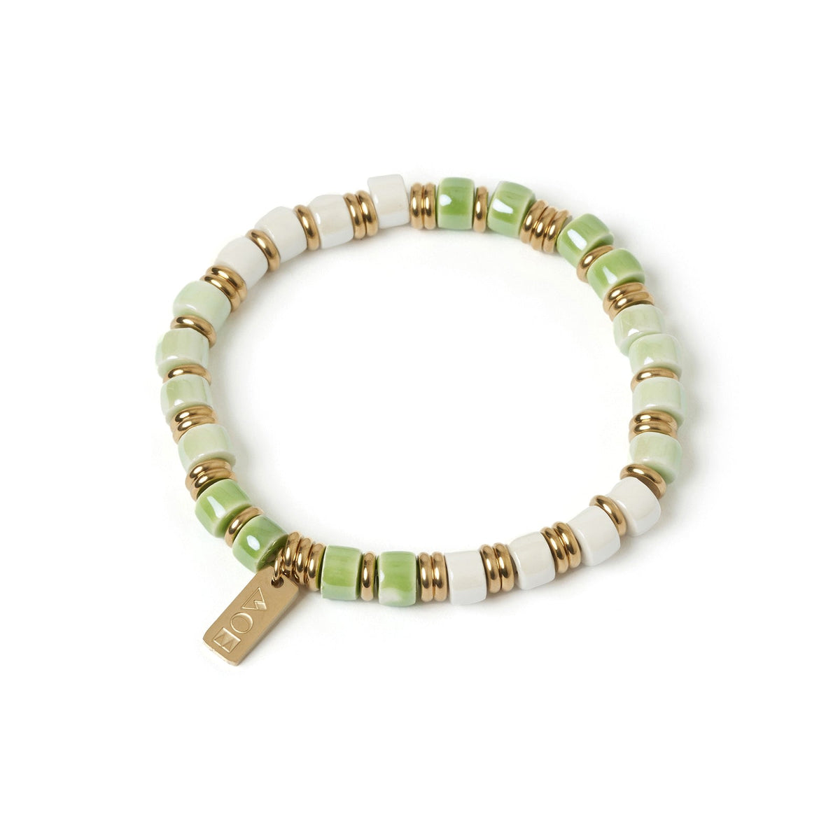 This Skylar Ceramic & Gold Bracelet by Arms of Eve is a fun and colorful piece that embodies the joyful spirit of summer. It features a beautiful ombre design of ceramic beads that are contrasted with glistening gold discs, creating a playful and eye-catching look. The bracelet's elastic fit makes it comfortable and versatile for a wide range of sizes. It's the perfect accessory for stacking with other bracelets or wearing on its own to add a vibrant pop of color to any outfit.
