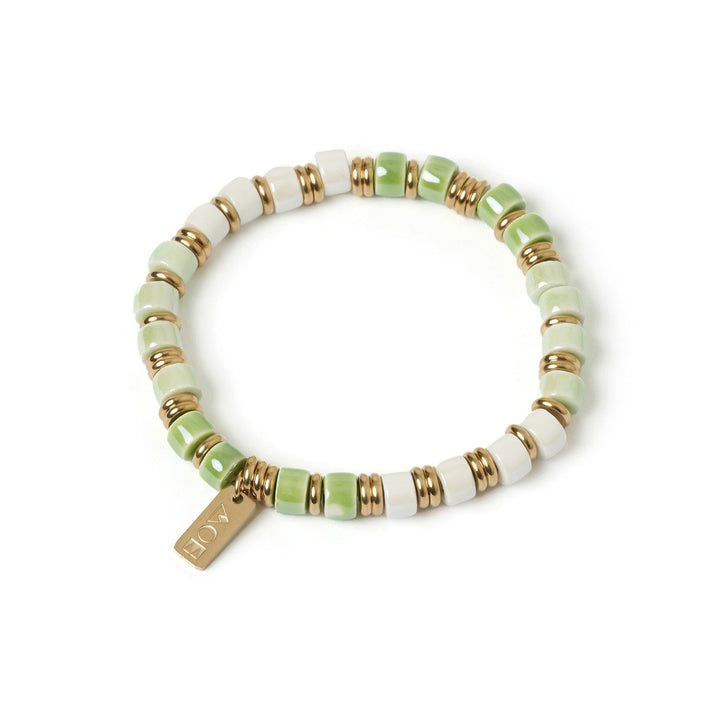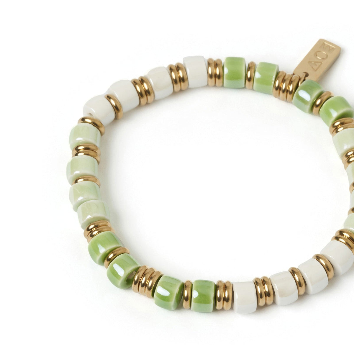 This bracelet is made with a 14k gold-plated (1 micron thick) stainless steel base and colorful ceramic beads. It is e-coated for a premium finish, lead and nickel-free, and has an elastic fit.
