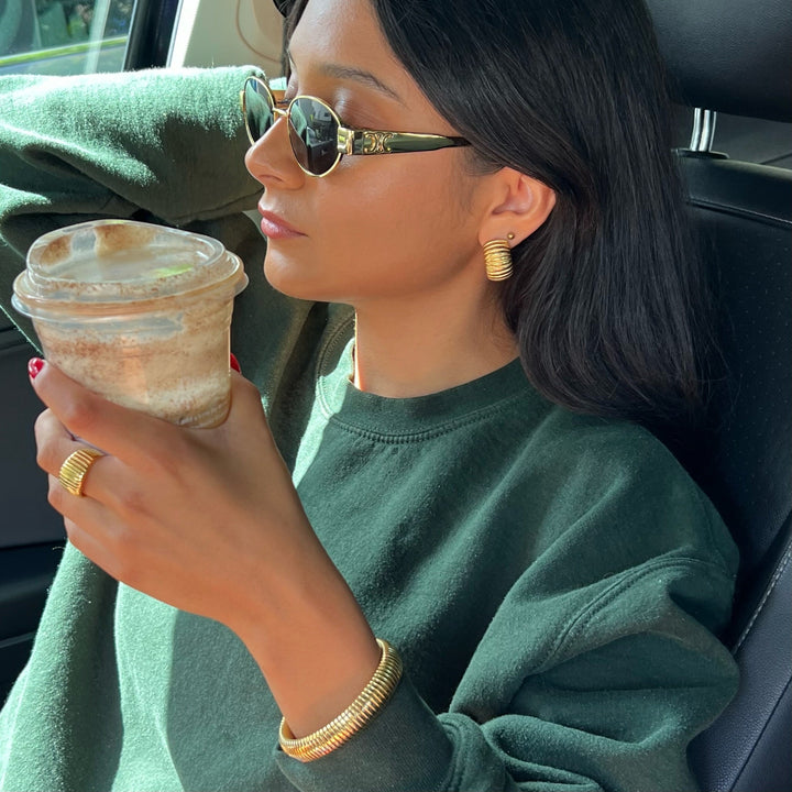 This Ellie Vail - Sandra Coil Bangle Bracelet by Ellie Vail Jewelry is a versatile and durable accessory for everyday activities. Made from marine grade stainless steel and plated in 18k gold, this bangle is designed to be water-resistant and hypoallergenic. Its sleek coil design and substantial thickness make it a sophisticated yet comfortable statement piece that can withstand an average amount of water and sweat.