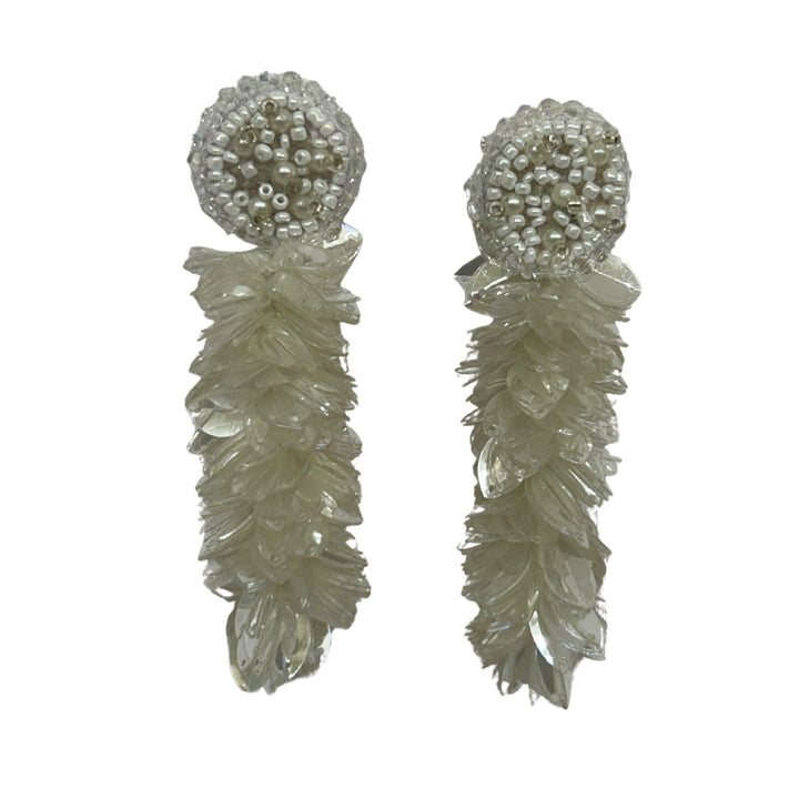 Handmade in India; ivory pearl beadwork; translucent sequin fringe; lightweight; post-back closure; length approx. 4".