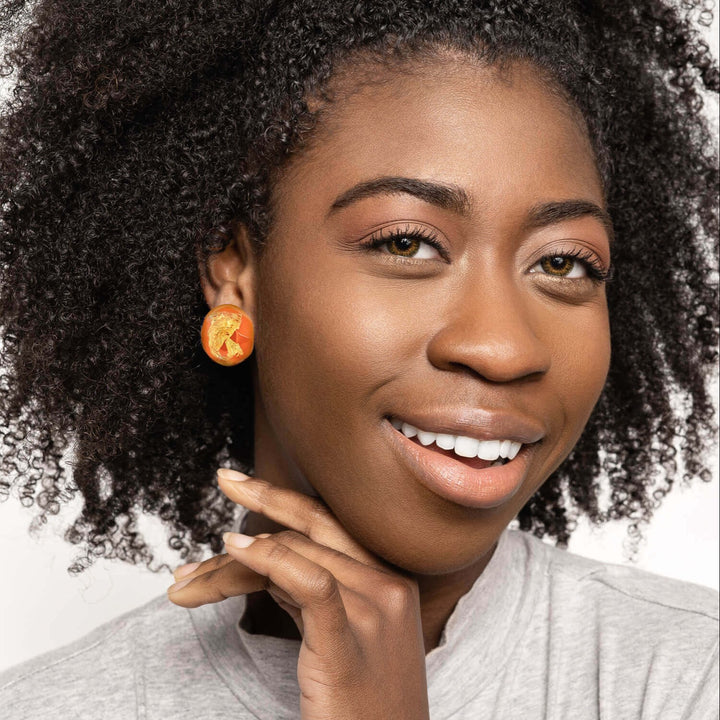 These 24K Gold Leaf Button Stud Earrings by Gold & Honey in Living Coral offer a stunning pop of color with stunning simplicity. The earrings are handcrafted with 24K gold leaf embedded in a lucite button shape, making them extremely lightweight for all-day wear. The vibrant coral hue and unique, shimmering gold leaf create an effortless and stylish statement. Each pair is unique due to the handmade process, ensuring your accessories are one-of-a-kind.