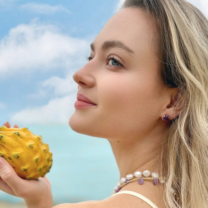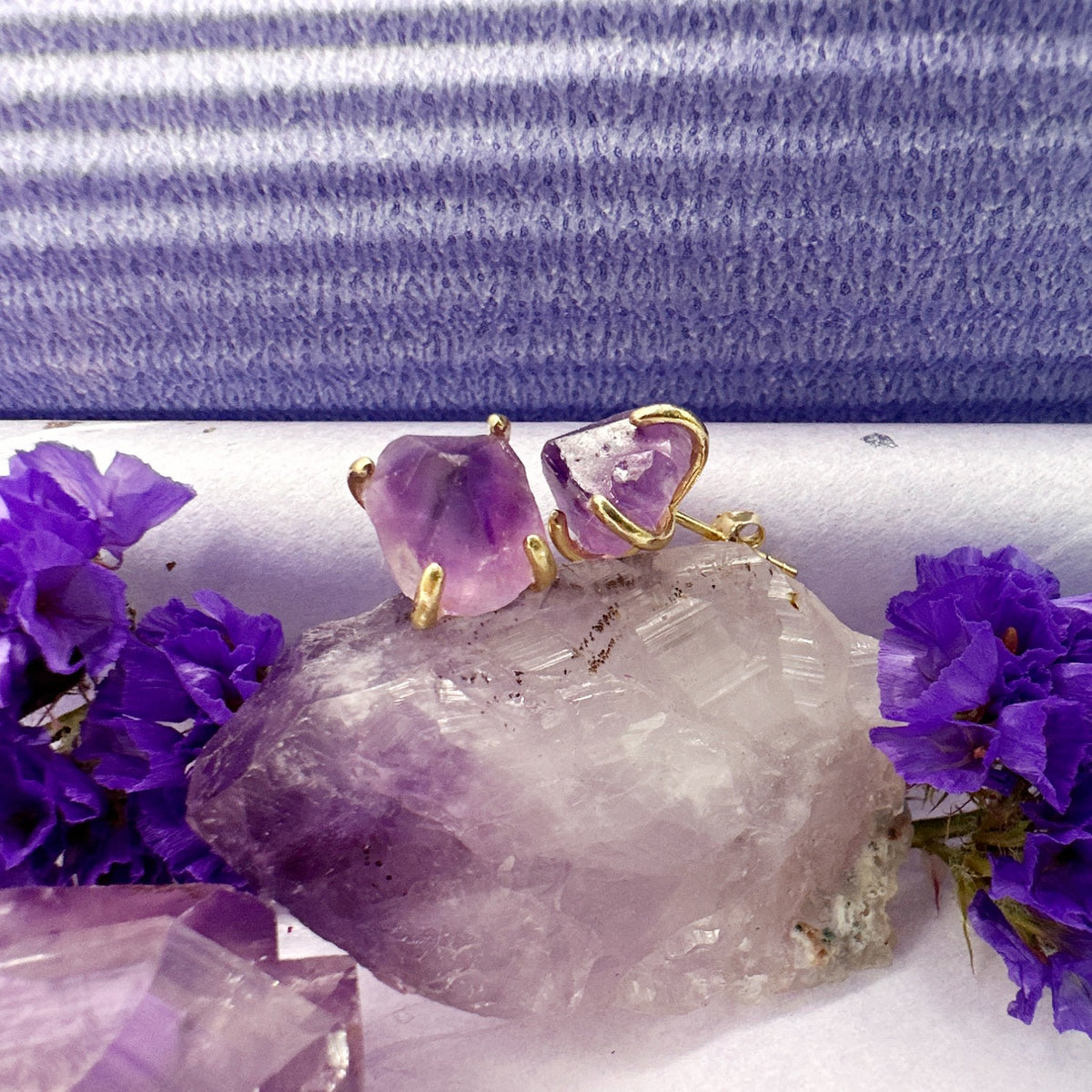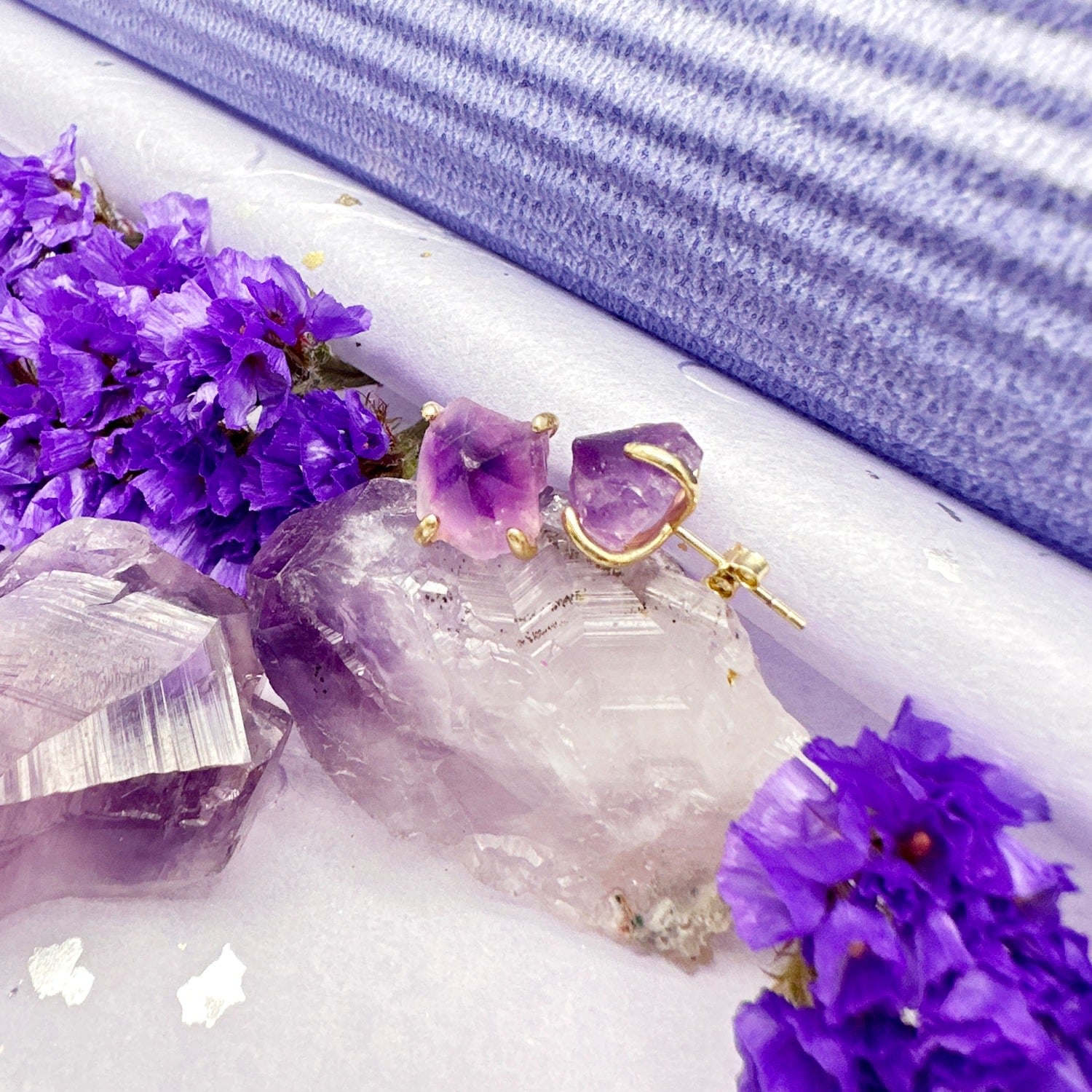 These stud earrings are made with natural amethyst gemstones. The setting is 14K gold plated brass with 925 sterling silver pins.